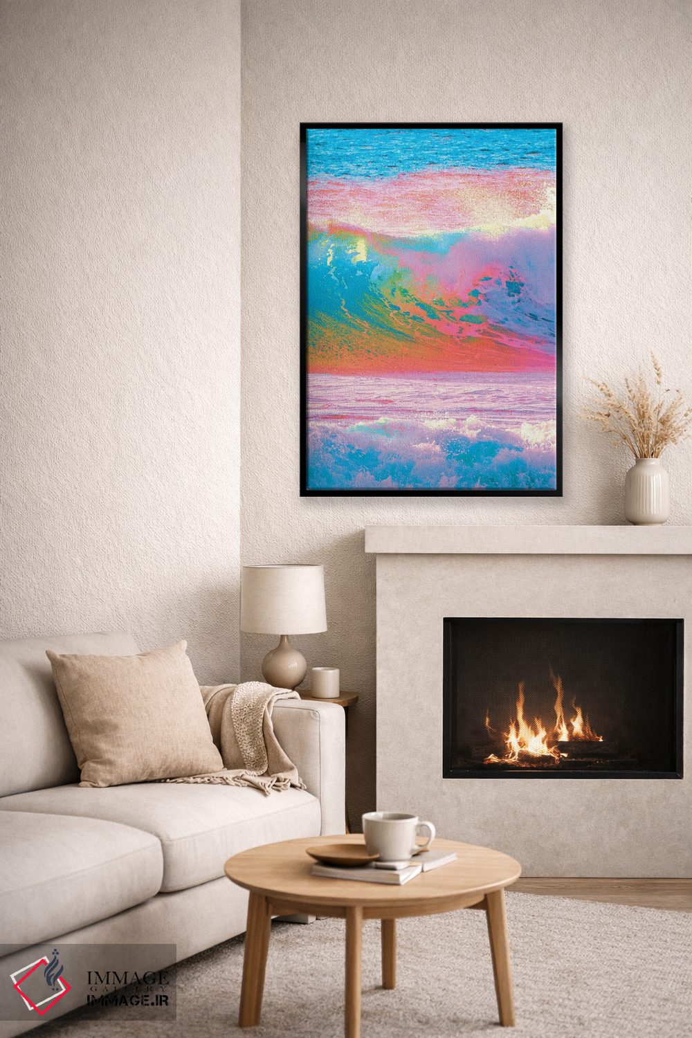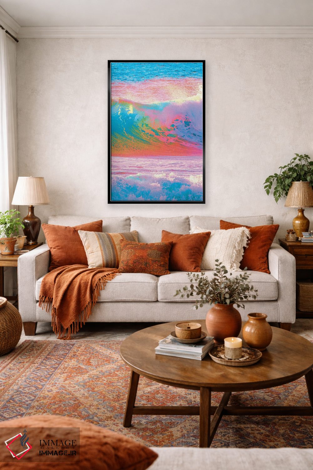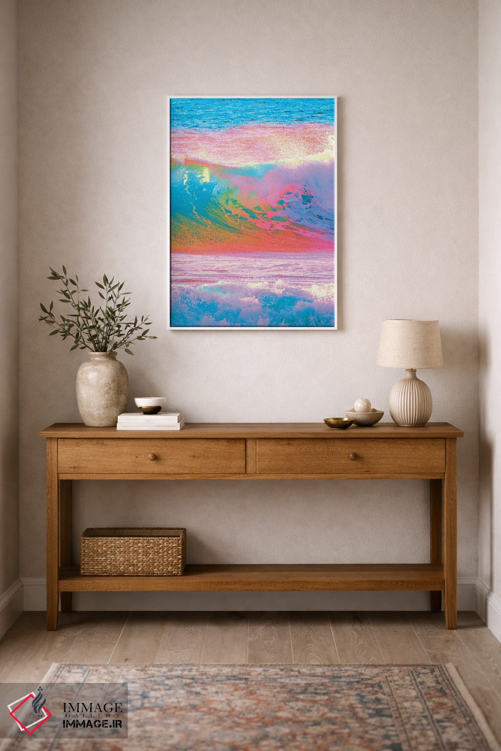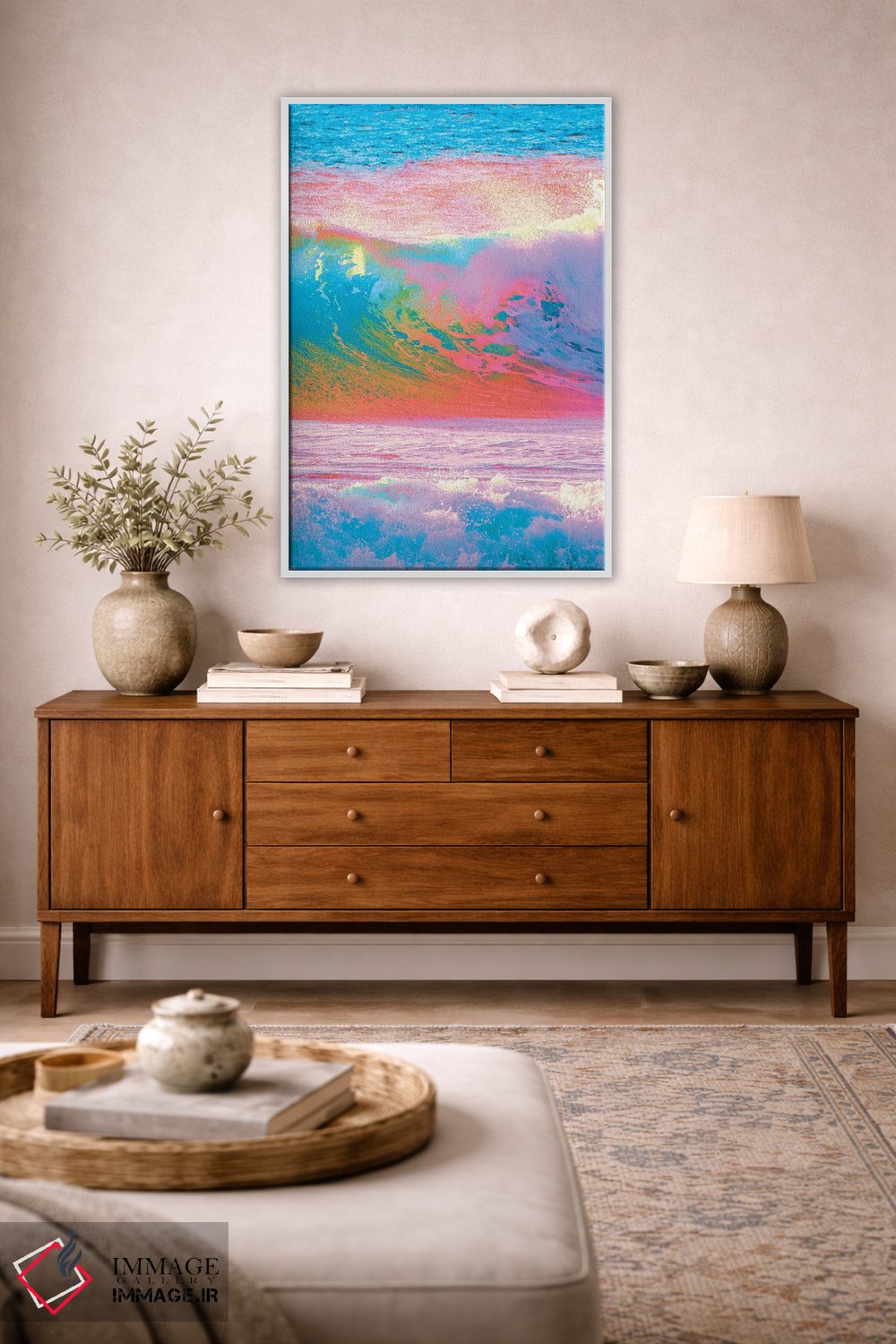براساس پالت ترکیبی اثر، قاب تیک گرم (چوبی) پیشنهاد اول است و مشکی مات (فریم متوسط) مکمل. برای سفارشهای پروژهای با ابعاد و قابهای اختصاصی با ایماژ در تماس باشید.