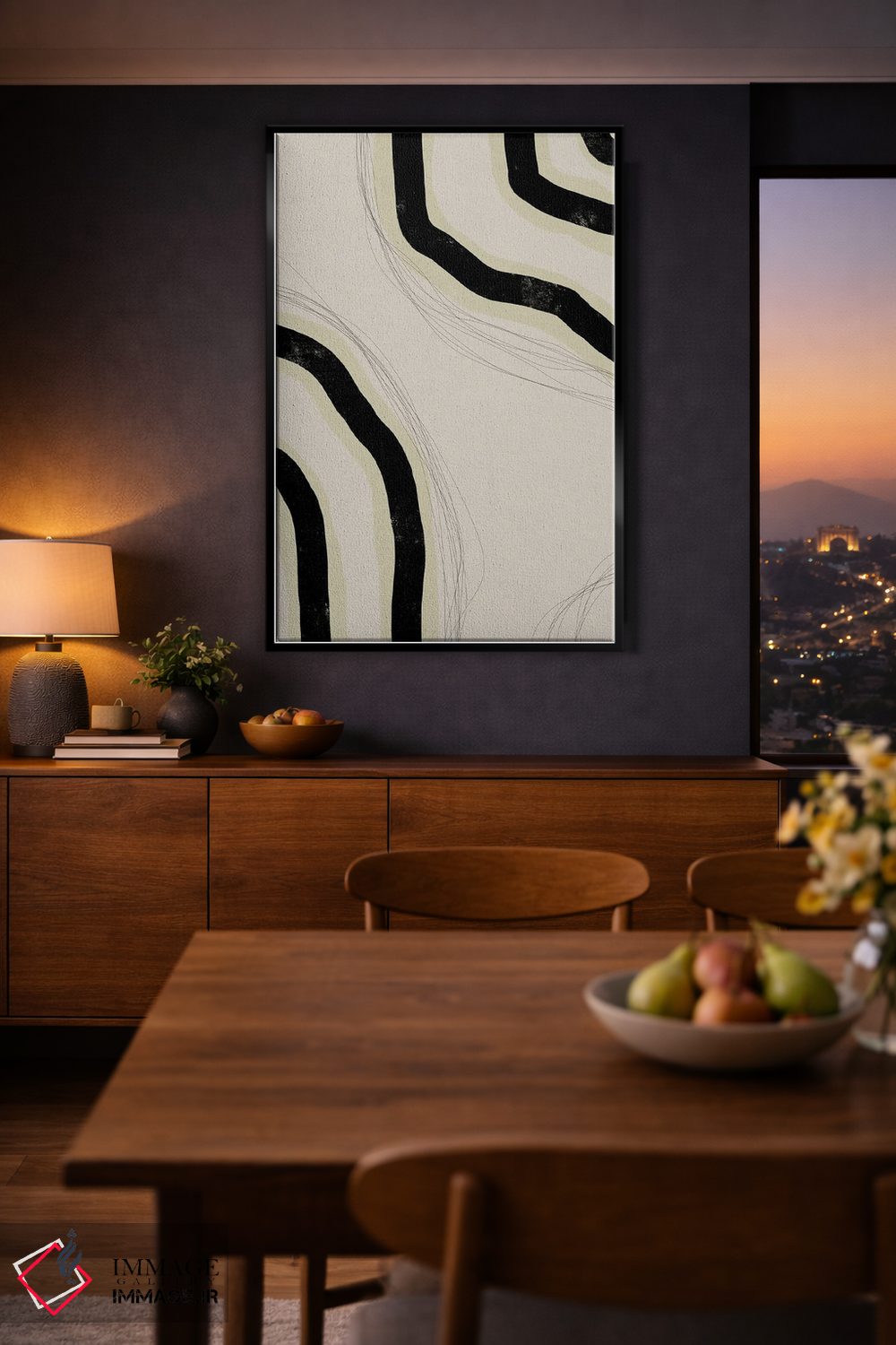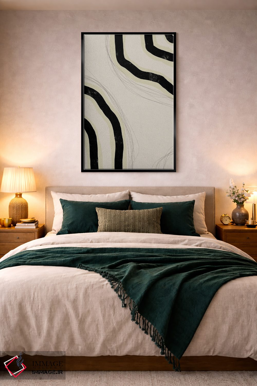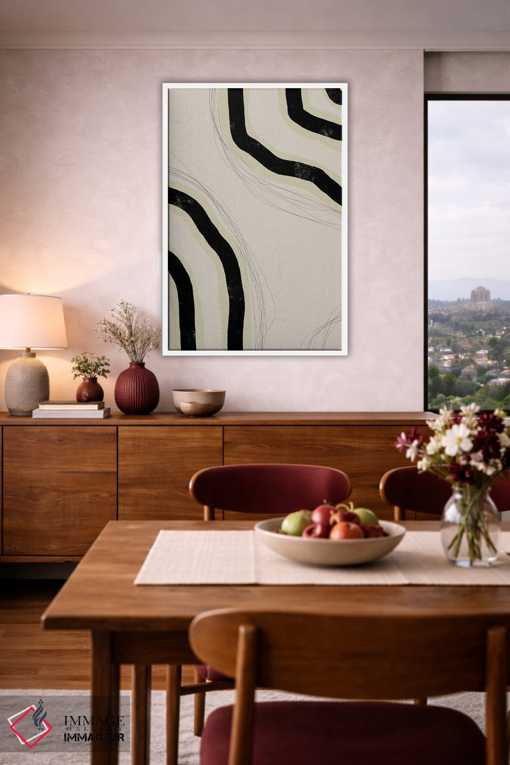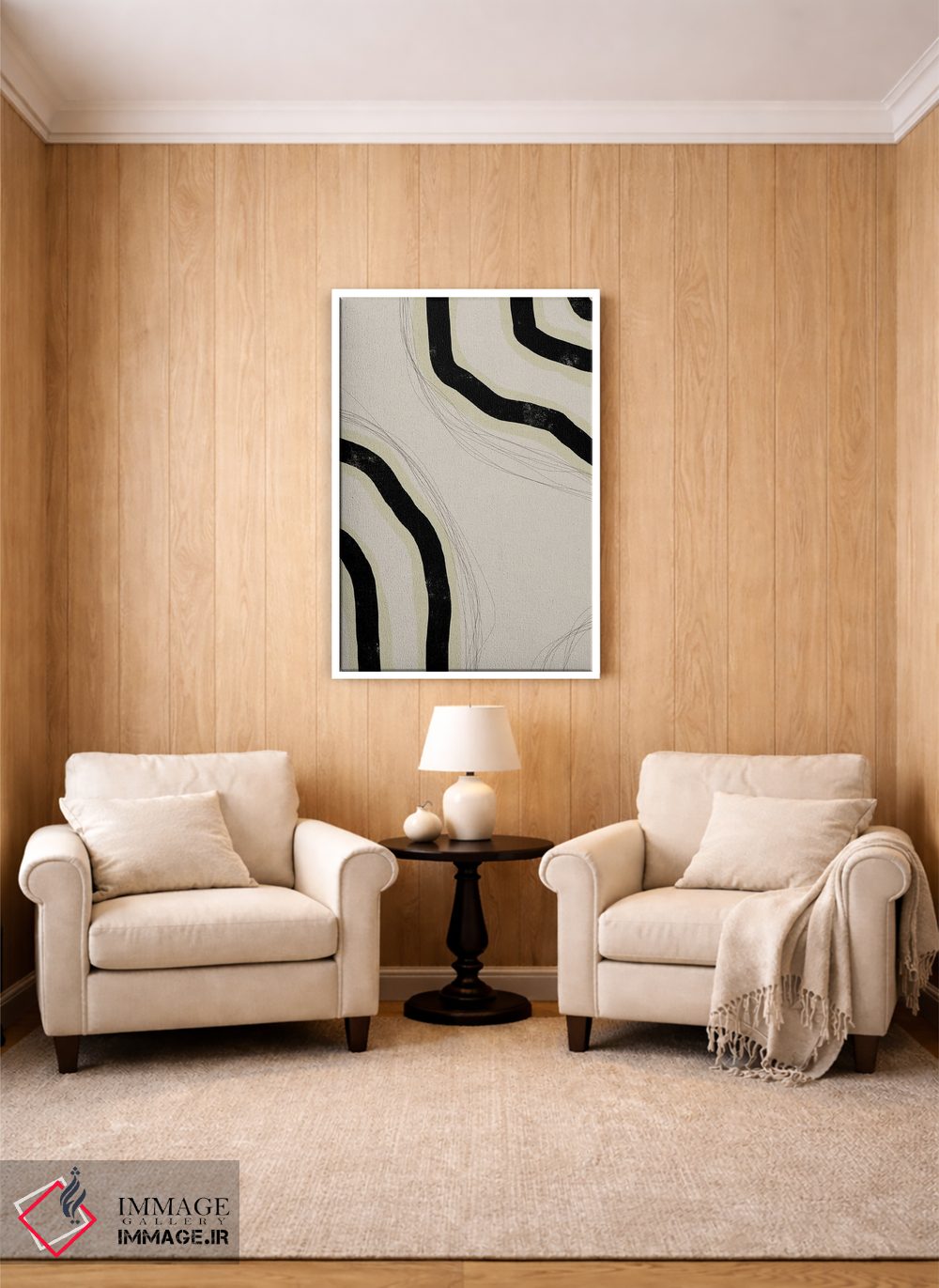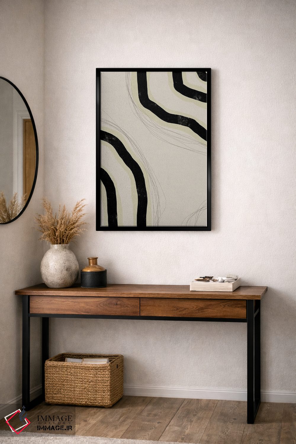 براساس پالت خنثی اثر، قاب بلوط روشن (چوبی) پیشنهاد اول است و استخوانی ملایم مکمل. برای سفارشهای پروژهای با ابعاد و قابهای اختصاصی با ایماژ در تماس باشید.