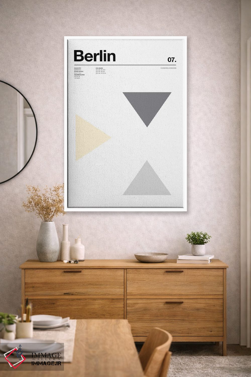 براساس پالت خنثی اثر، قاب بلوط روشن (چوبی) پیشنهاد اول است و استخوانی ملایم مکمل. برای سفارشهای پروژهای با ابعاد و قابهای اختصاصی با ایماژ در تماس باشید.