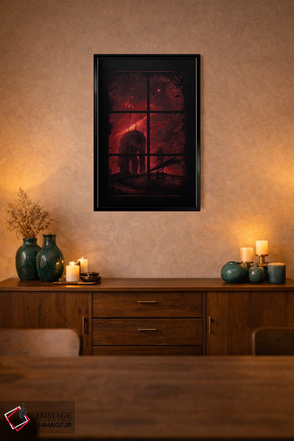 براساس پالت گرم اثر، قاب تیک گرم (چوبی) پیشنهاد اول است و مشکی مات (فریم متوسط) مکمل. برای سفارشهای پروژهای با ابعاد و قابهای اختصاصی با ایماژ در تماس باشید.