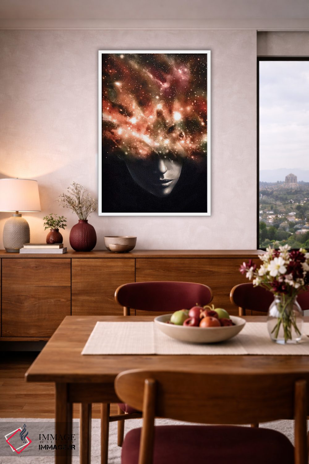 اگر ابعاد دیوار را دارید، با ایماژ از طریق تماس—با—ما/">تماس با ما در ارتباط باشید. اگر انتخابتان این است که اثر در محیط «هنری و خلاق» دیده شود، نور موضعی ملایم نتیجه را بهتر نشان میدهد و جلوهی گالریوار بیشتری میدهد.