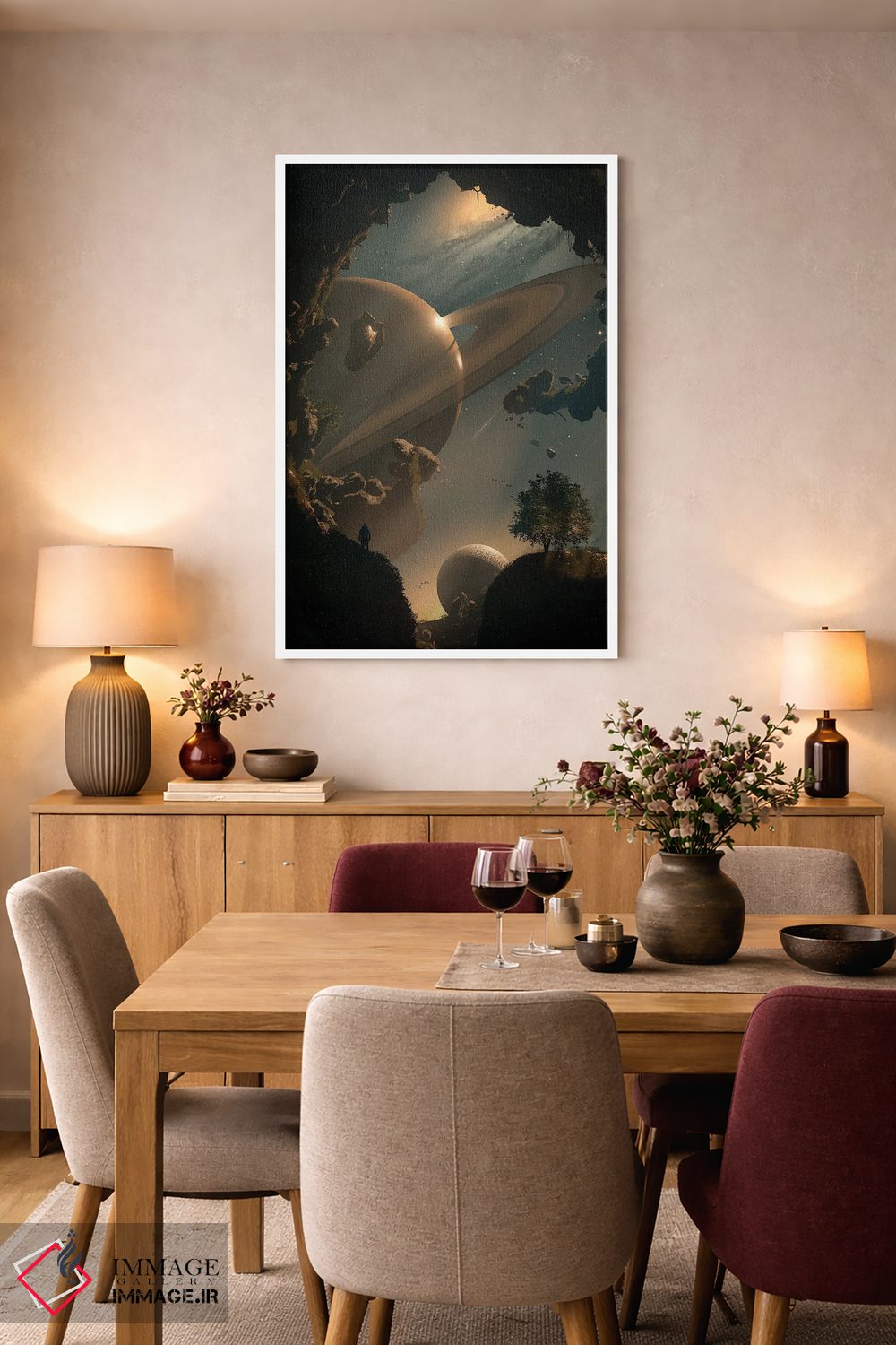 براساس پالت گرم اثر، قاب بلوط روشن (چوبی) پیشنهاد اول است و استخوانی ملایم مکمل. برای سفارشهای پروژهای با ابعاد و قابهای اختصاصی با ایماژ در تماس باشید.