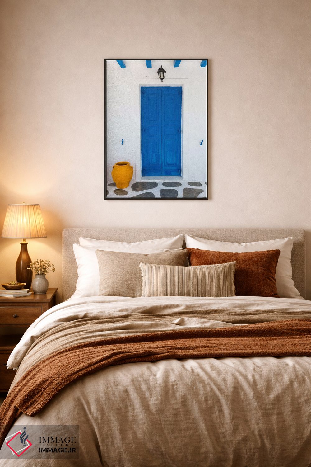 «Mykonos، Greece I، خانه سرگرمی، میکونوس، یونان ۱» اثرِ «جیم نیلسن» یک قاب دکوراتیوِ گرم و دلنشین است؛ این اثر در اجرای پرداختِ هنری، فضا را نرمتر و صمیمیتر نشان میدهد.