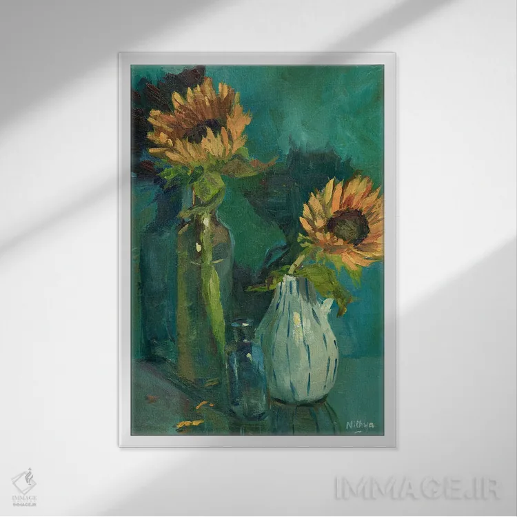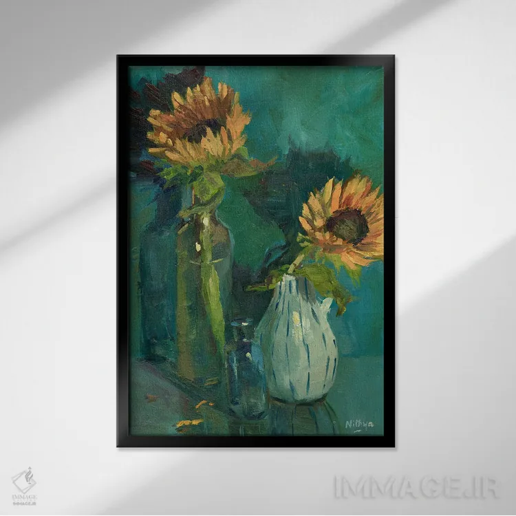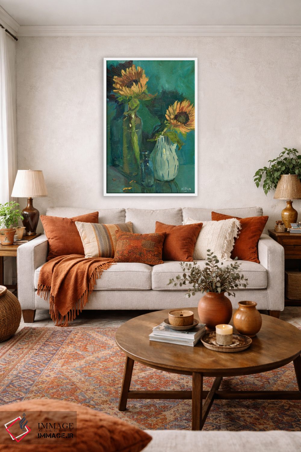 براساس پالت ترکیبی اثر، قاب تیک گرم (چوبی) پیشنهاد اول است و مشکی مات (فریم متوسط) مکمل. برای سفارشهای پروژهای با ابعاد و قابهای اختصاصی با ایماژ در تماس باشید.