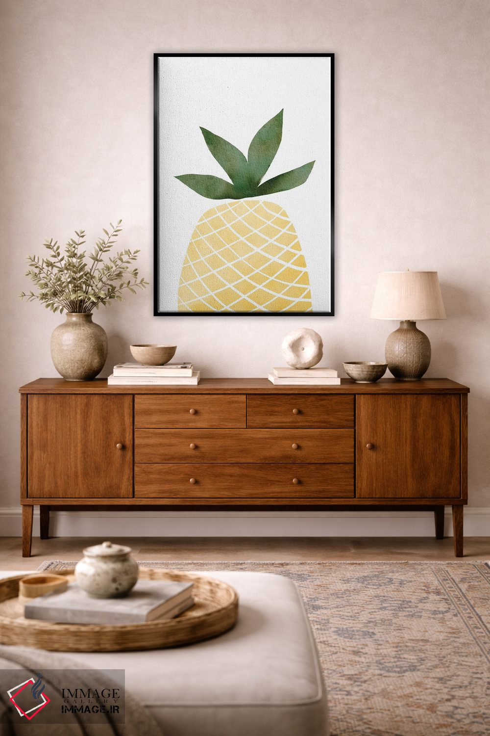 این تابلو با عنوان «آناناس» اثرِ «نیکی»، حسِ گرم و صمیمی به فضا میدهد.