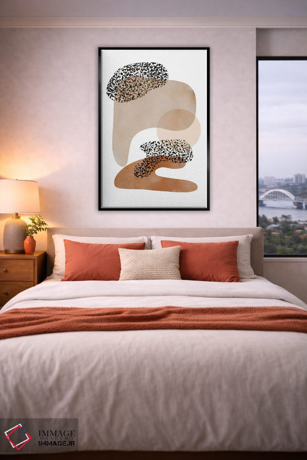 براساس پالت گرم اثر، قاب بلوط روشن (چوبی) پیشنهاد اول است و استخوانی ملایم مکمل. برای سفارشهای پروژهای با ابعاد و قابهای اختصاصی با ایماژ در تماس باشید.
