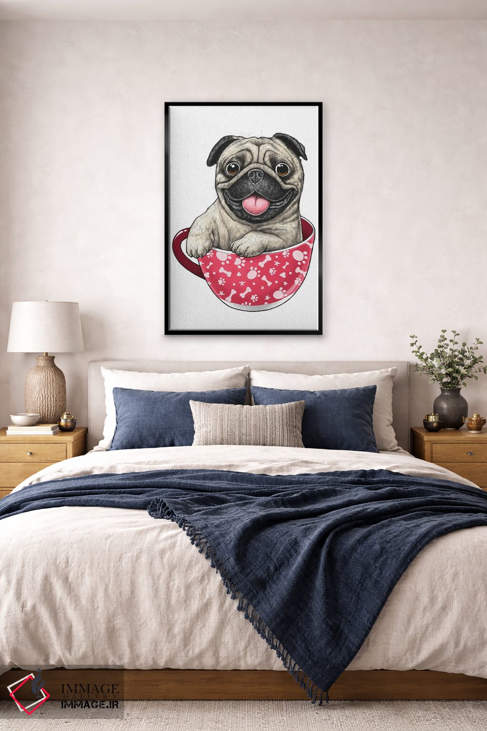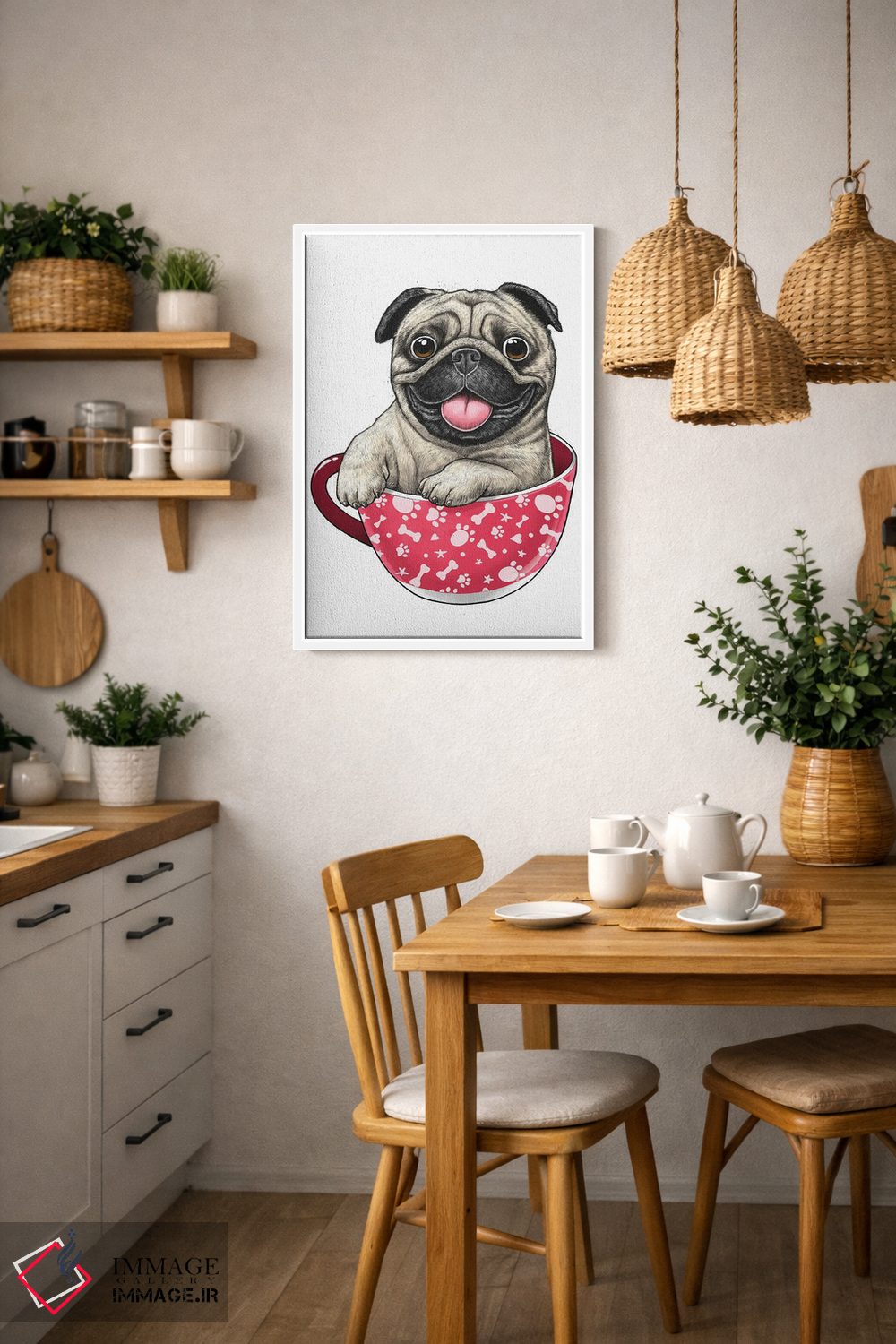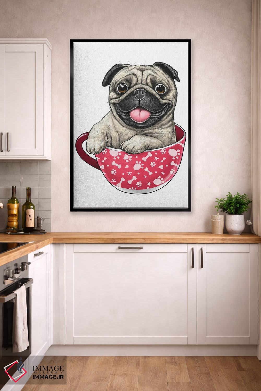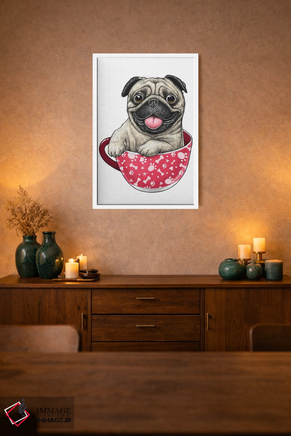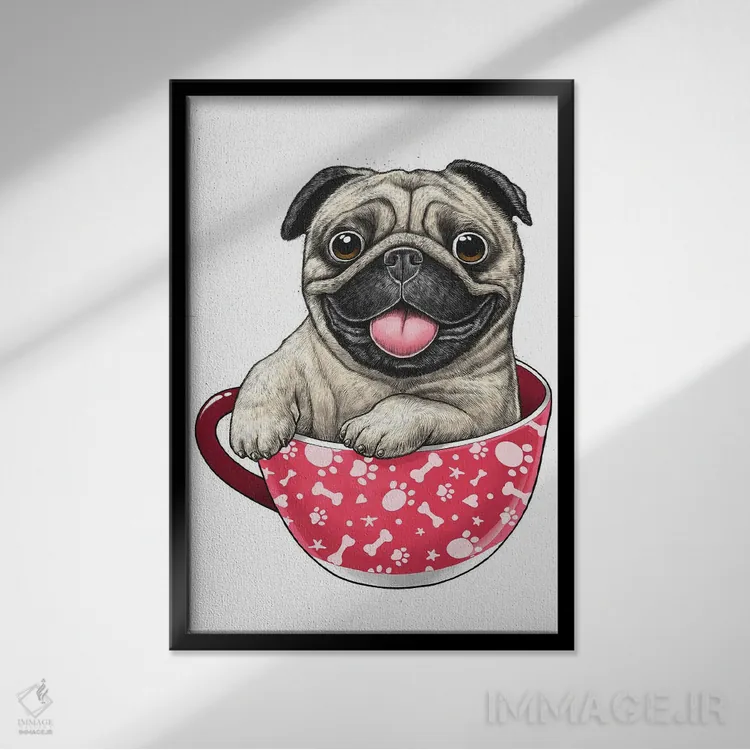 در «پاگ درون فنجان» اثرِ «نیکیتا کورنکوف»، حضور حیوانات یک لبخند ریز به چیدمان میدهد؛ برای کافههای کوچک و صمیمی انتخابی خوشسلیقه است. برای دیوار گالریوار هم گزینهٔ خوبیست.