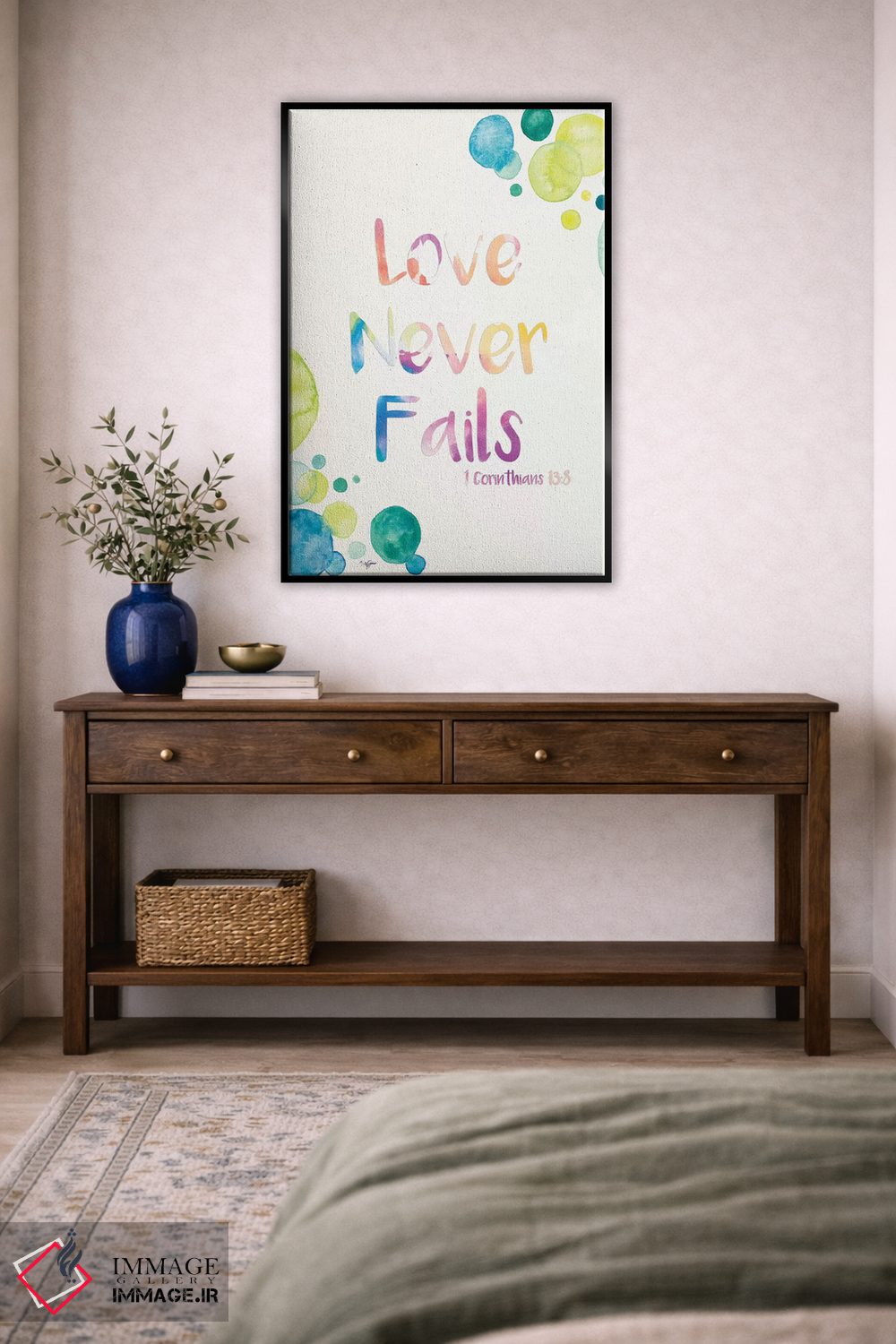 اگر میخواهید دیوار از «پسزمینه» بیرون بیاید، «عشق هرگز شکست نمیخورد» اثرِ «نولا جیمز» چیدمان را از حالت پراکنده خارج میکند؛ برای فضاهای کمنور که به «نقطهٔ روشن» نیاز دارند پیشنهاد میشود. برای ترکیب با چوب، سنگ یا فلز، انتخابی دقیق است.