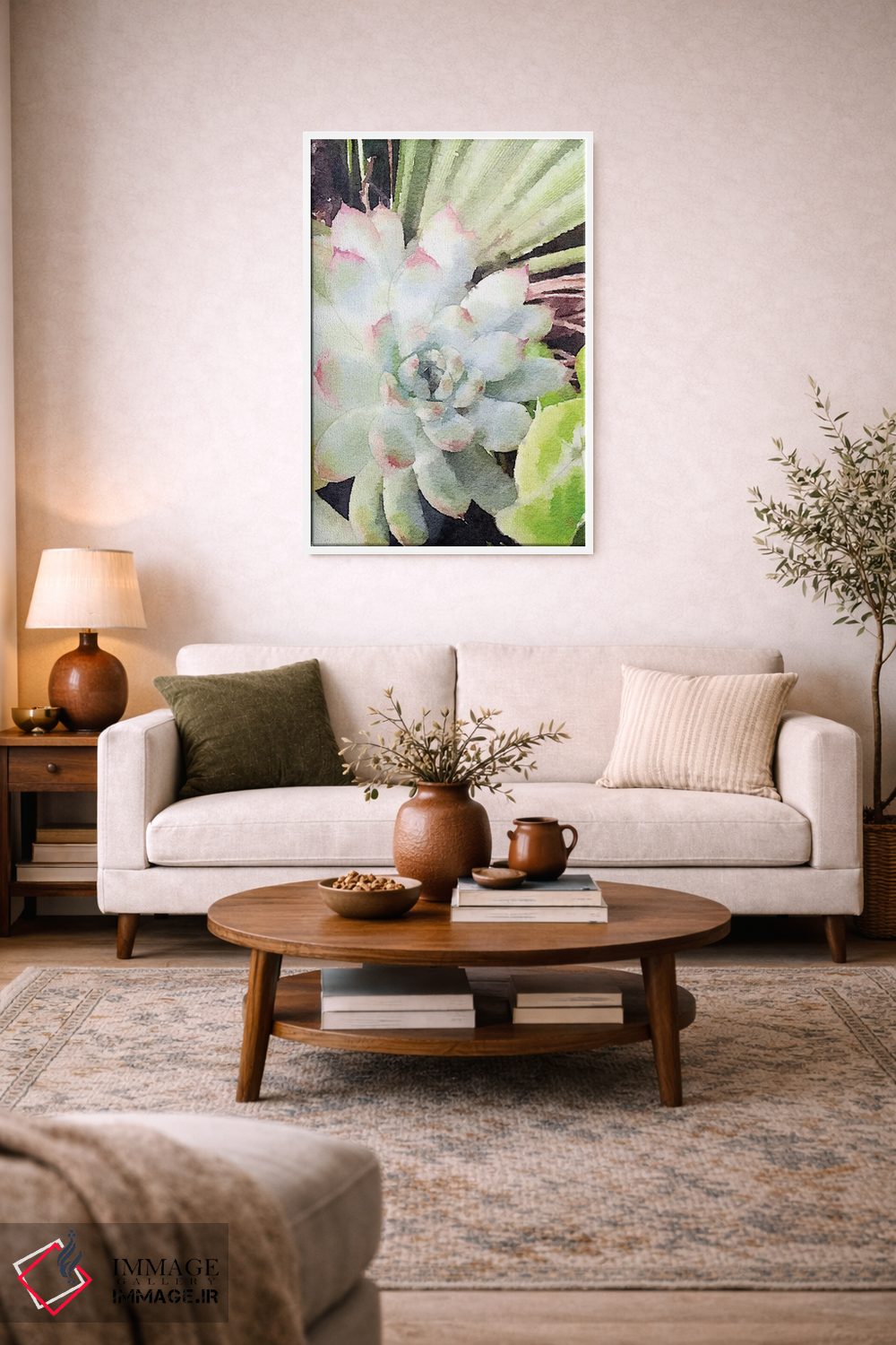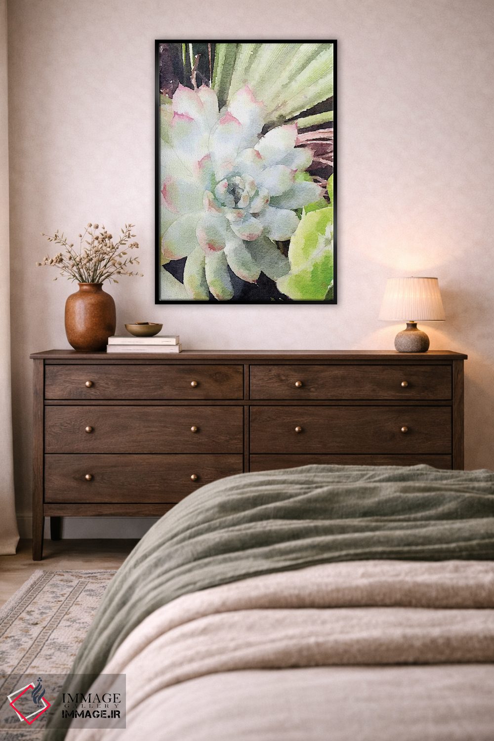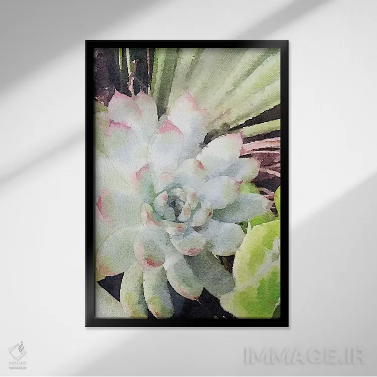 اگر دوست دارید دیوار روشنتر و آرامتر دیده شود، «ساکولنت سبز آبرنگی (گیاه گوشتی)» اثرِ «نولا جیمز» حس طراوت را بدون شلوغی وارد اتاق میکند، برای دکورهای اسکانباوراوی گزینهٔ مناسبیست. حضورش آرام است، اما بیاثر نیست.
