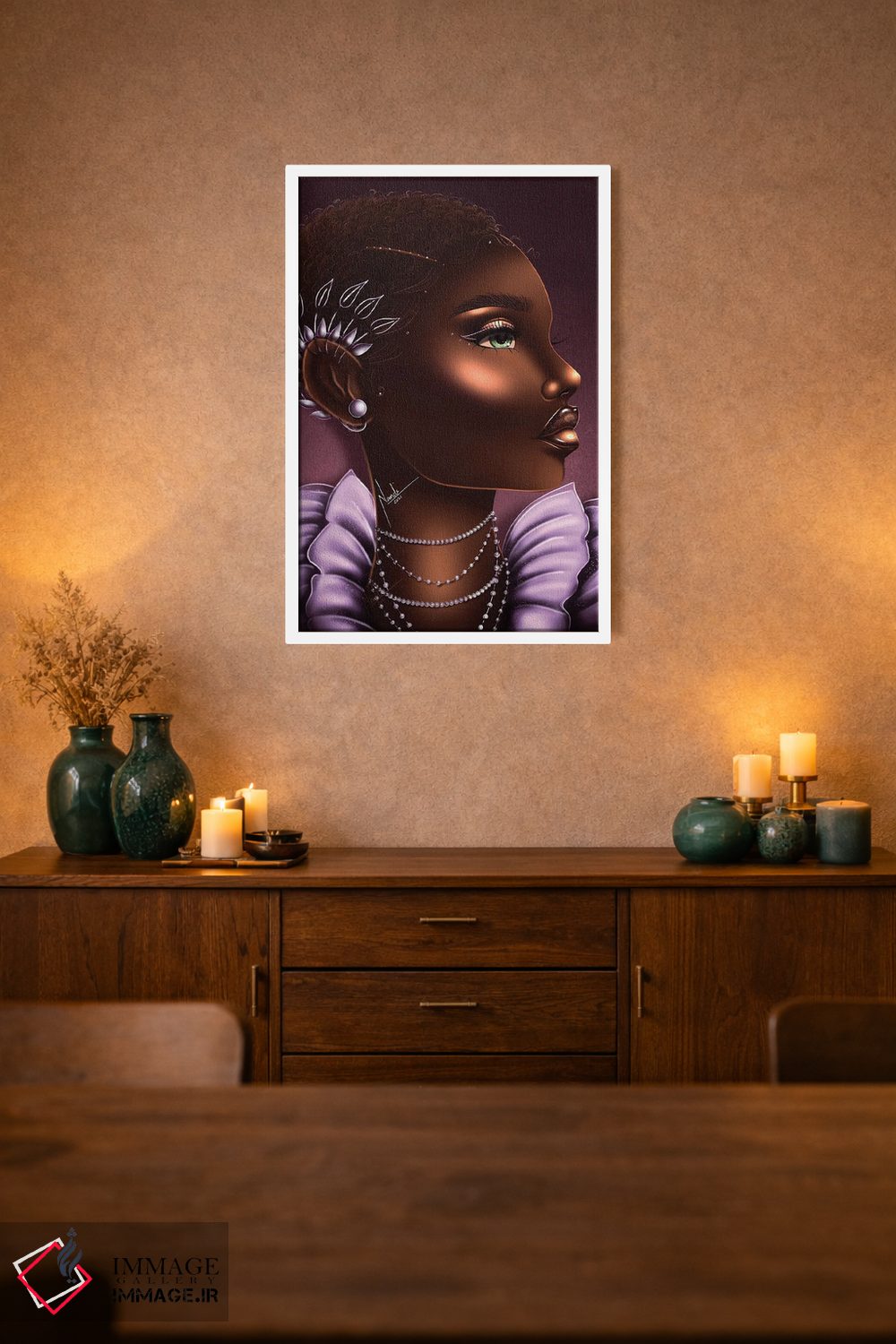 براساس پالت گرم اثر، قاب تیک گرم (چوبی) پیشنهاد اول است و مشکی مات (فریم متوسط) مکمل. برای سفارشهای پروژهای با ابعاد و قابهای اختصاصی با ایماژ در تماس باشید.