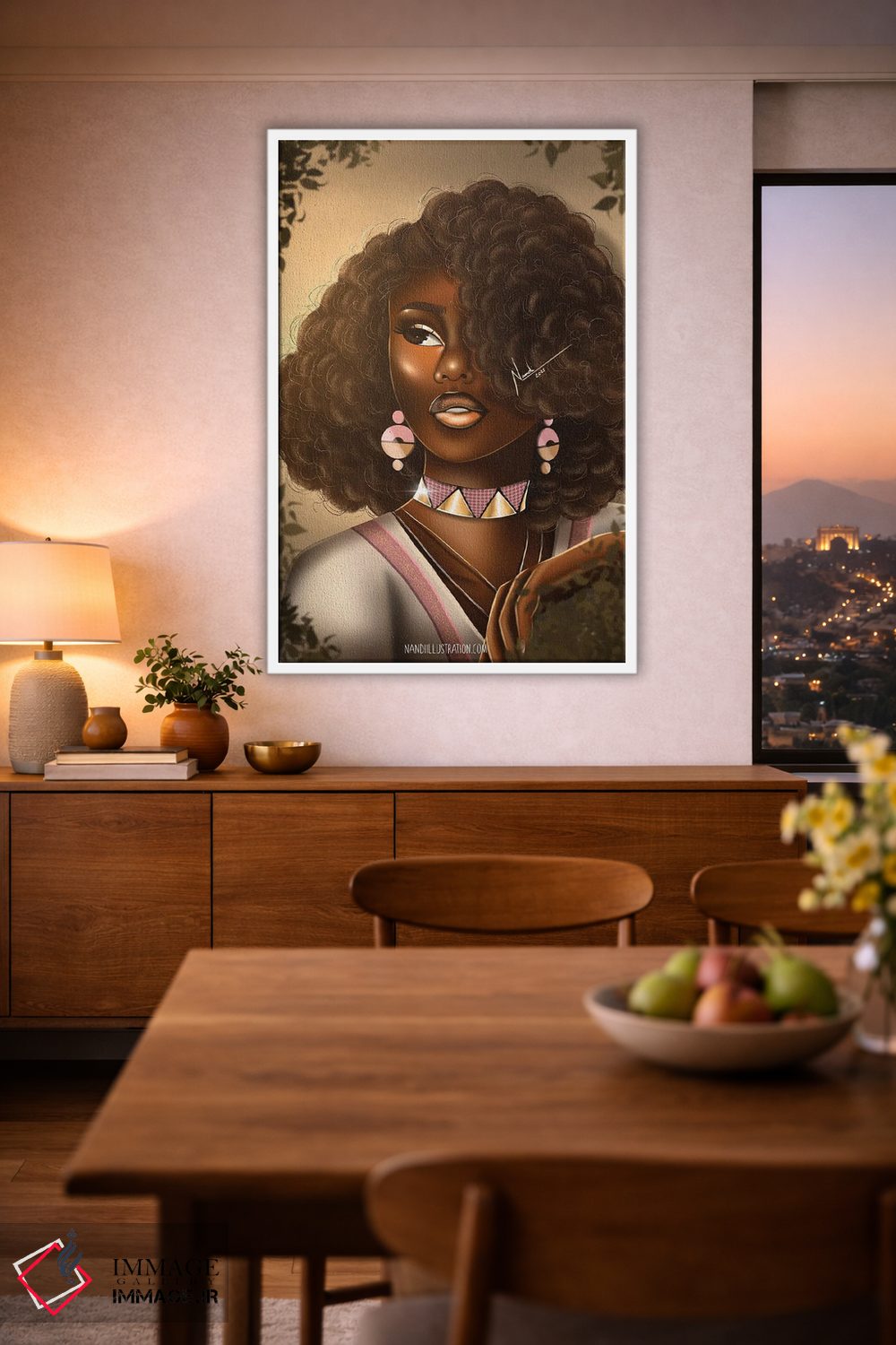 براساس پالت گرم اثر، قاب بلوط روشن (چوبی) پیشنهاد اول است و استخوانی ملایم مکمل. برای سفارشهای پروژهای با ابعاد و قابهای اختصاصی با ایماژ در تماس باشید.