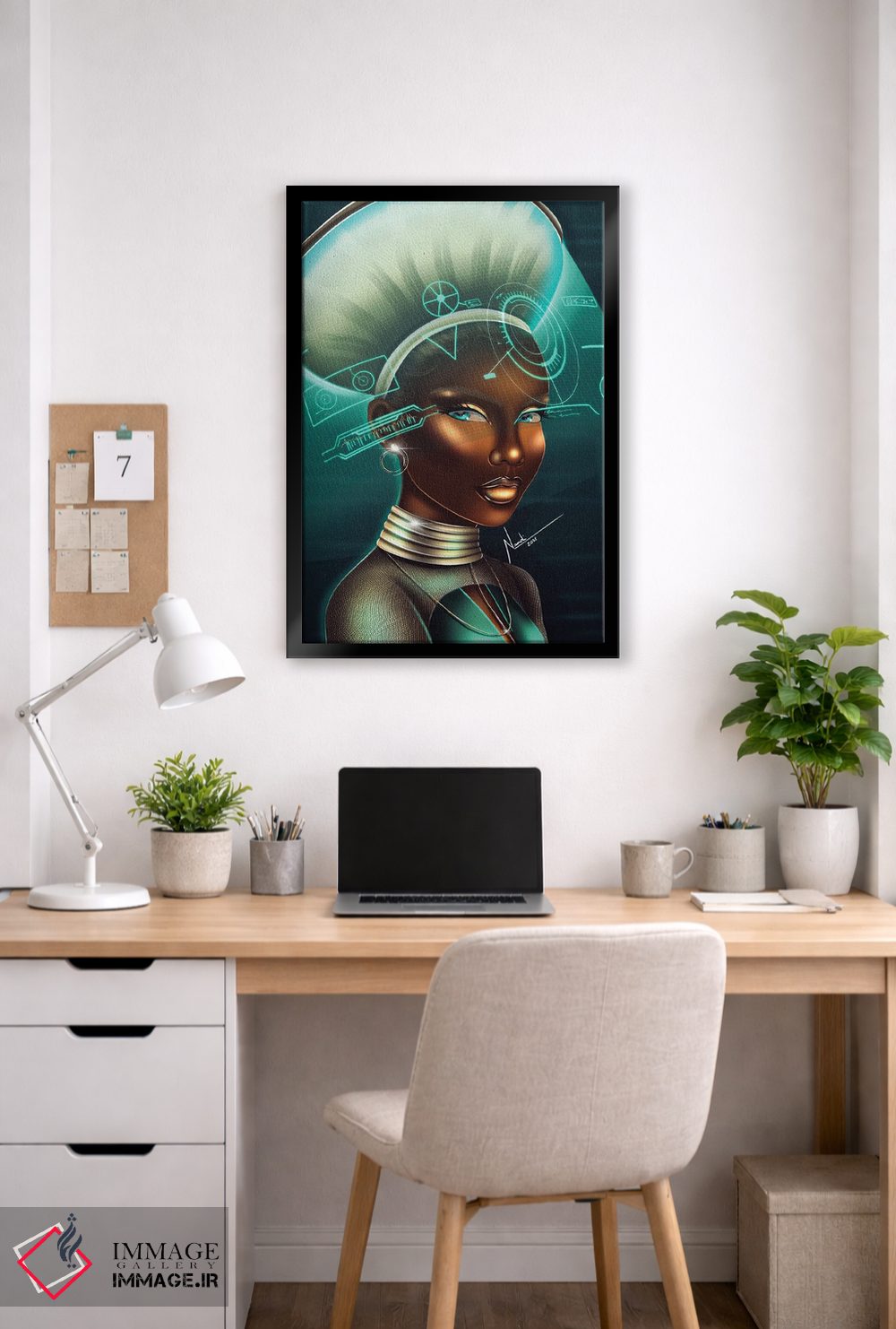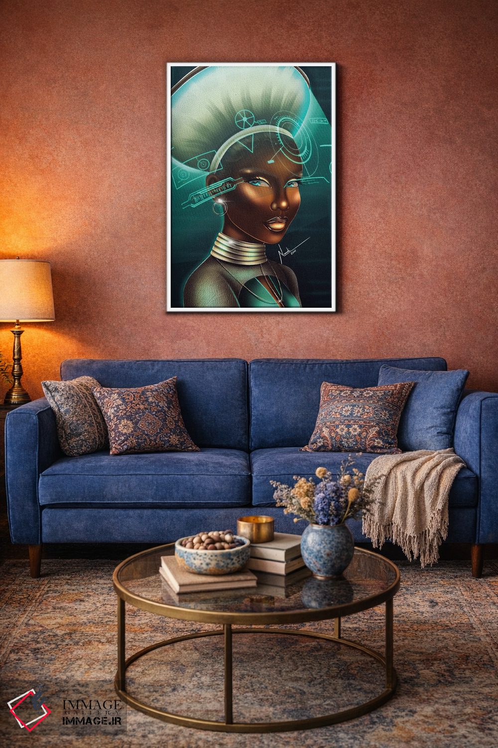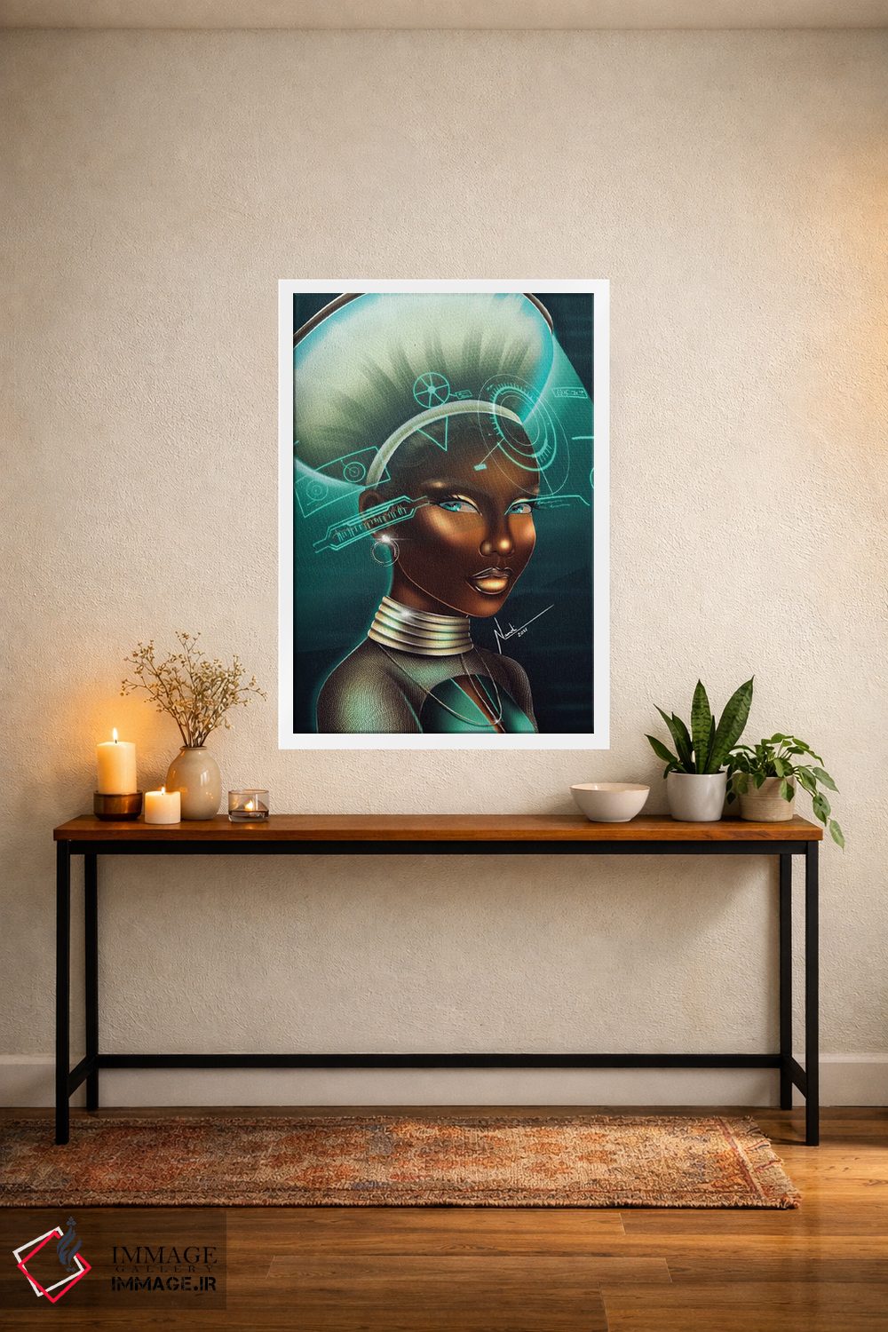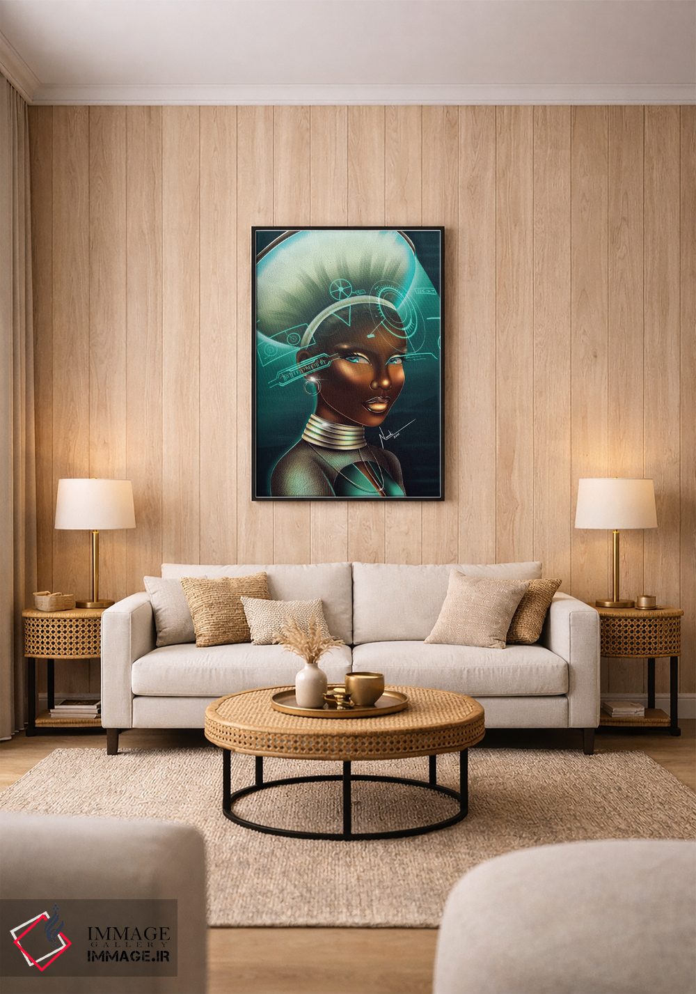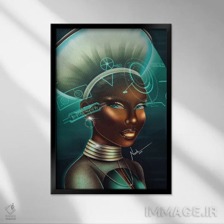 براساس پالت ترکیبی اثر، قاب تیک گرم (چوبی) پیشنهاد اول است و مشکی مات (فریم متوسط) مکمل. برای سفارشهای پروژهای با ابعاد و قابهای اختصاصی با ایماژ در تماس باشید.