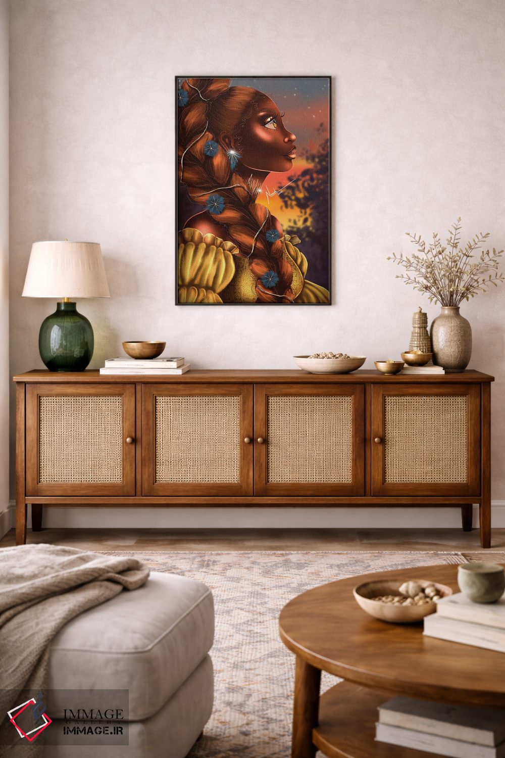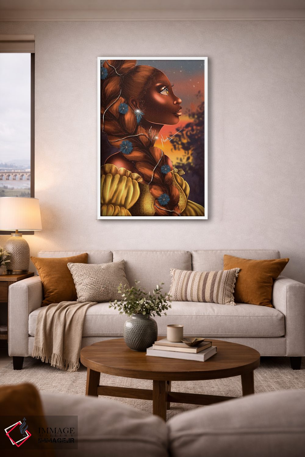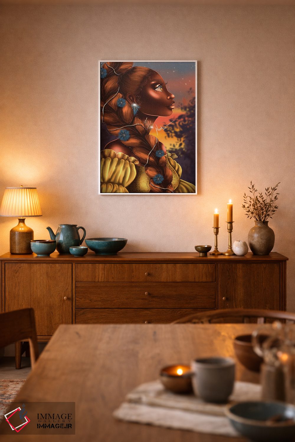 براساس پالت ترکیبی اثر، قاب تیک گرم (چوبی) پیشنهاد اول است و مشکی مات (فریم متوسط) مکمل. برای سفارشهای پروژهای با ابعاد و قابهای اختصاصی با ایماژ در تماس باشید.