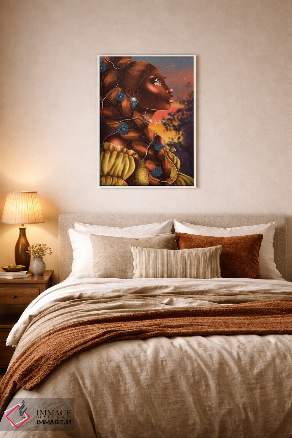 بوم گالری ایماژ نسخهی چیدماناتیوِ گالریپسند از یک اثر هنری است؛ روی کنواس سفیدِ یکدست و بدون اسید با فرآیند چاپ حرفهای جیکلی (Giclée) و کنترل دقیق تونها با جوهرهای آرشیویِ حرفهای برای لایههای رنگی خواناتر؛ این ترکیب باعث میشود گذارهای رنگی نرمتر و بافتها خواناتر شوند.