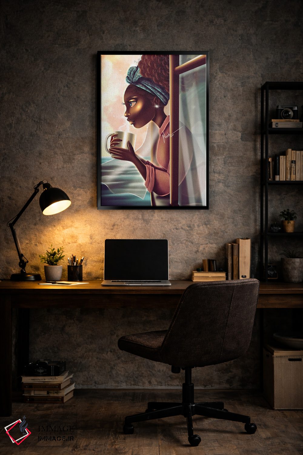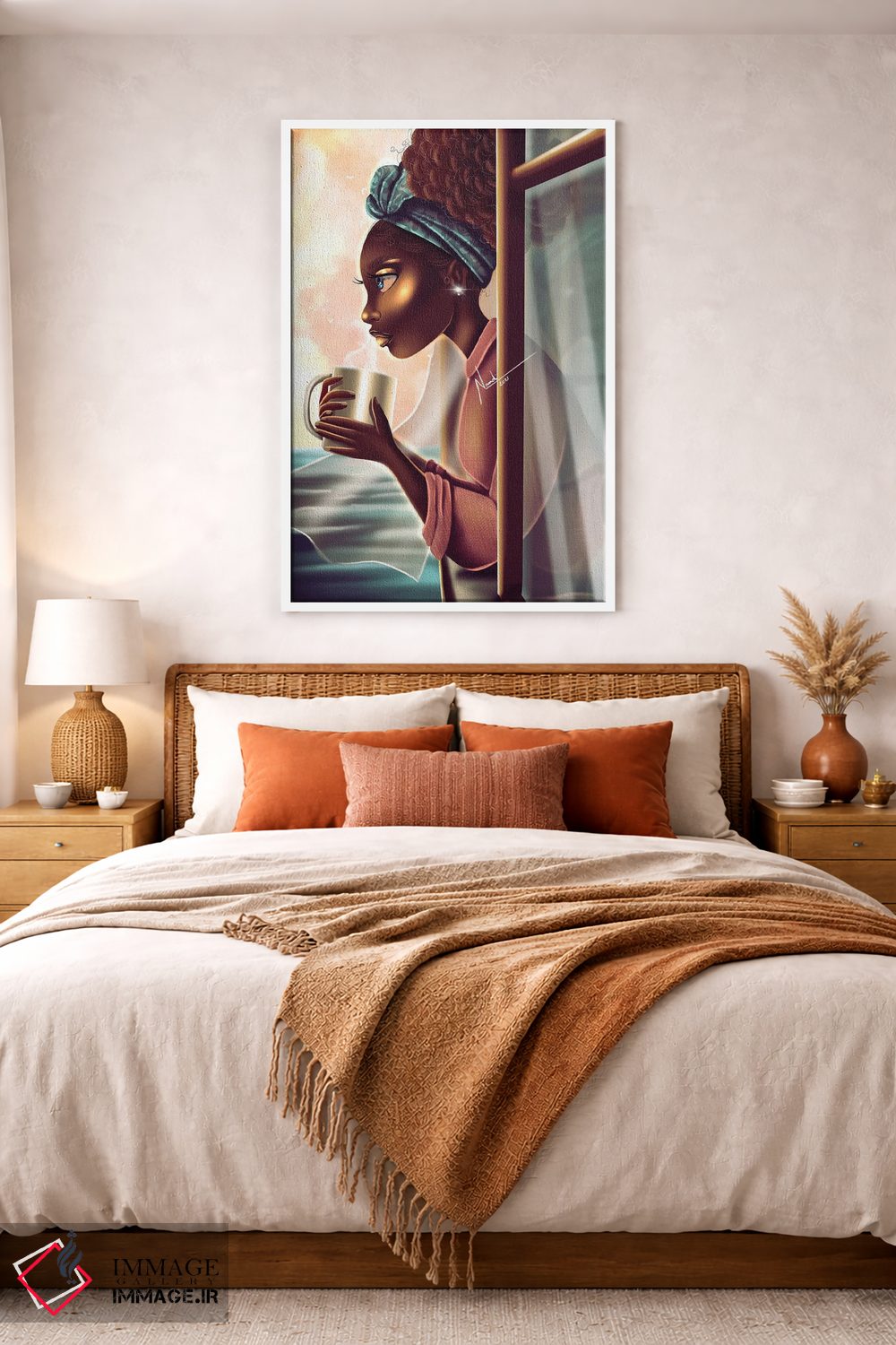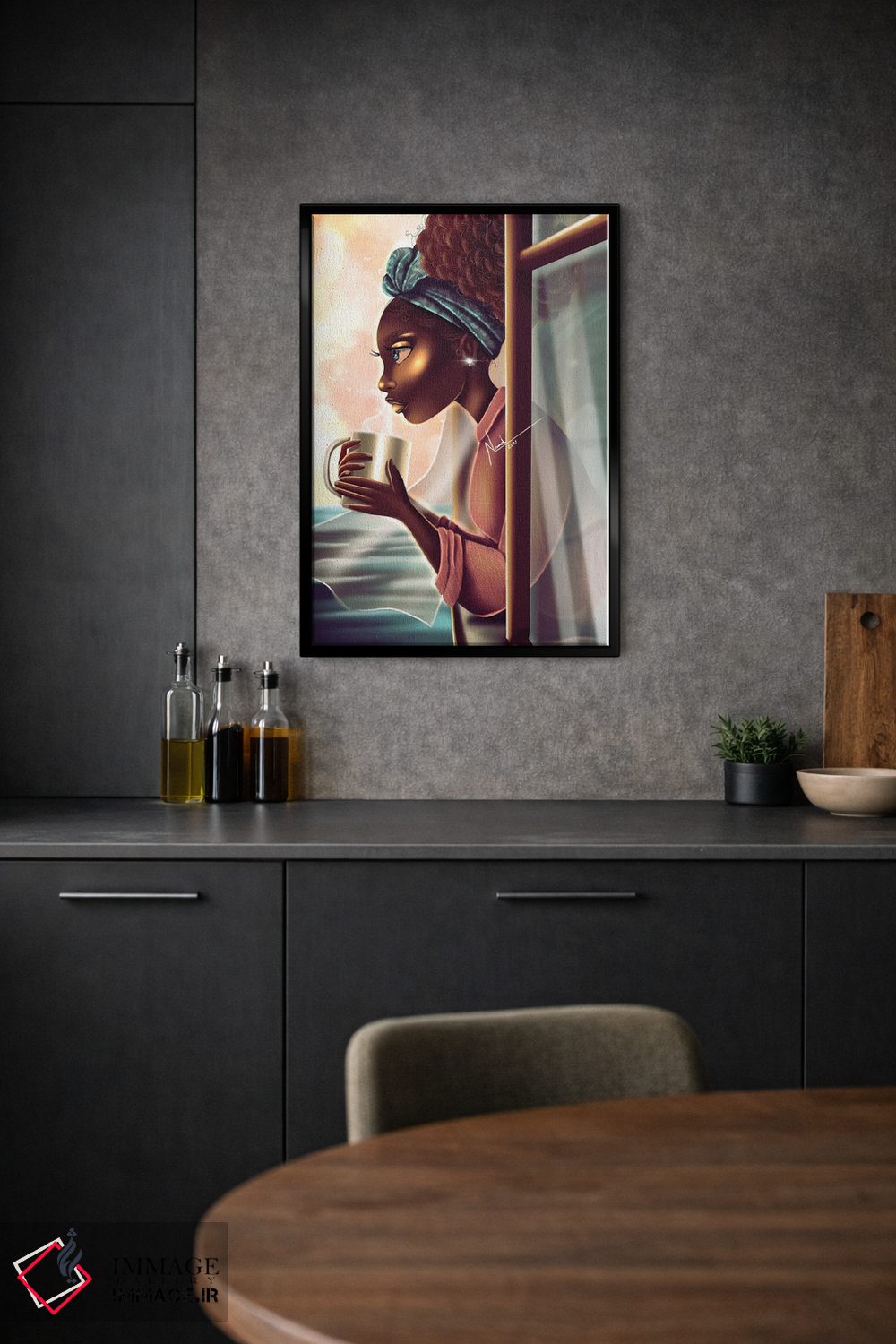 براساس پالت گرم اثر، قاب تیک گرم (چوبی) پیشنهاد اول است و مشکی مات (فریم متوسط) مکمل. برای سفارشهای پروژهای با ابعاد و قابهای اختصاصی با ایماژ در تماس باشید.