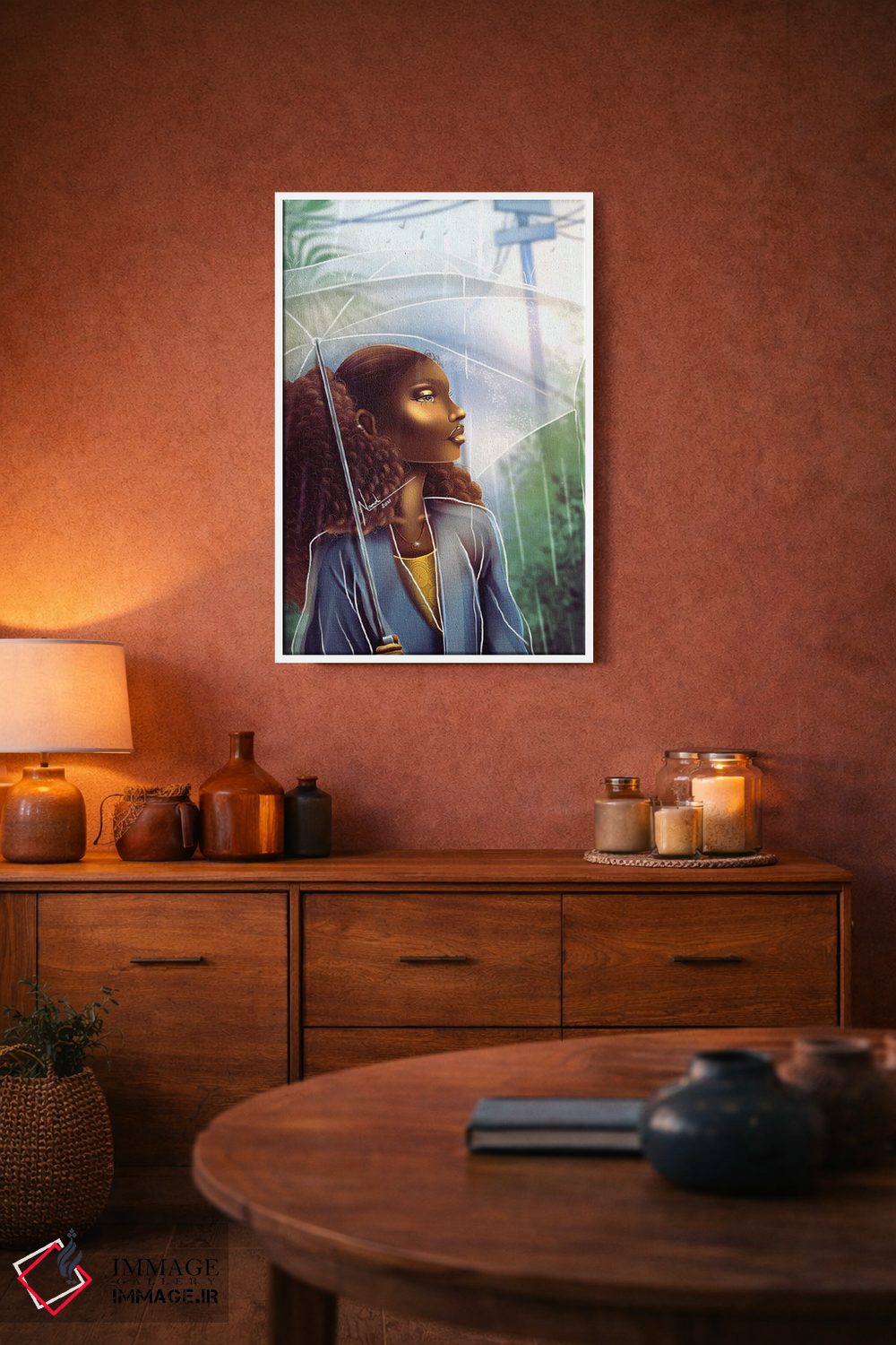 براساس پالت ترکیبی اثر، قاب تیک گرم (چوبی) پیشنهاد اول است و مشکی مات (فریم متوسط) مکمل. برای سفارشهای پروژهای با ابعاد و قابهای اختصاصی با ایماژ در تماس باشید.