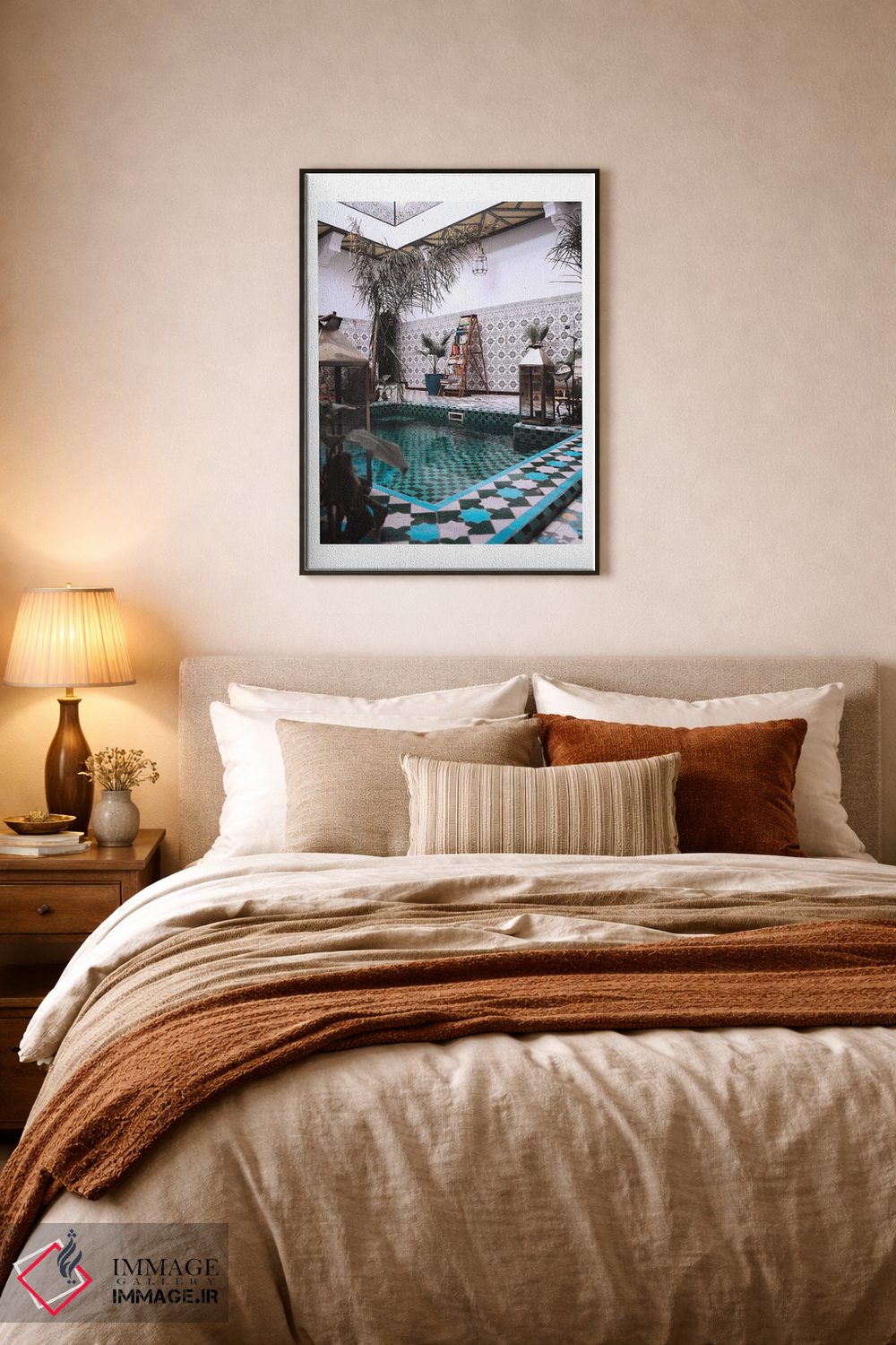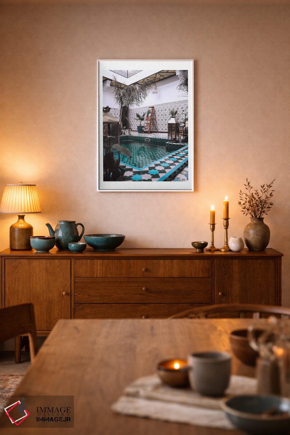 «استخر مراکشی آبی» اثرِ «نائومی دیویس» با حالوهوای این اثر، برای بالای کنسول یا کنار قابهای ساده، ترکیب چشمنوازی میسازد.
