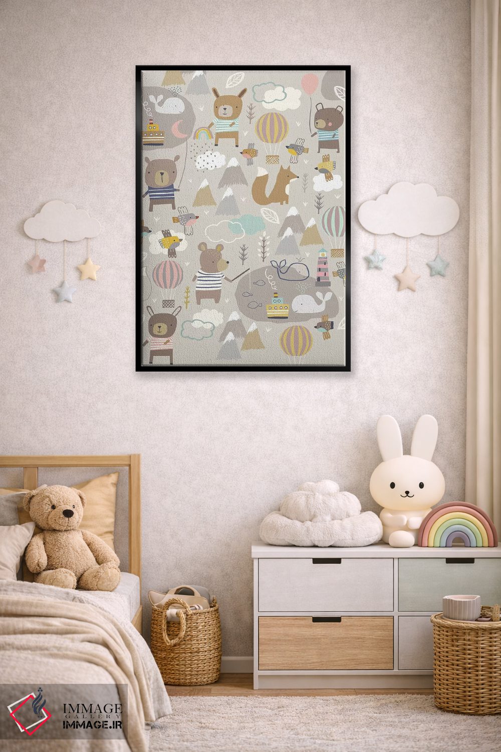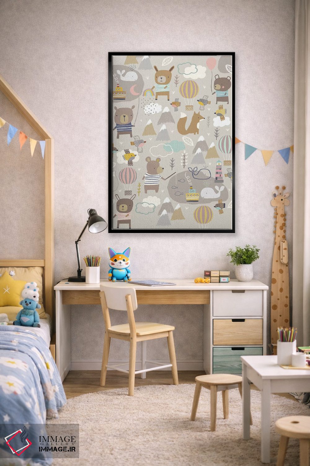 در «ماجراجویی بادکنکی کودکانه ۱» اثرِ «نانسی مککنزی»، حضور حیوانات مثل یک امضای بامزه اما متین عمل میکند؛ برای دکورهایی با رنگهای خنثی انتخابی خوشسلیقه است. به دیوار، قصه میدهد—اما قصهای آرام و شیک.