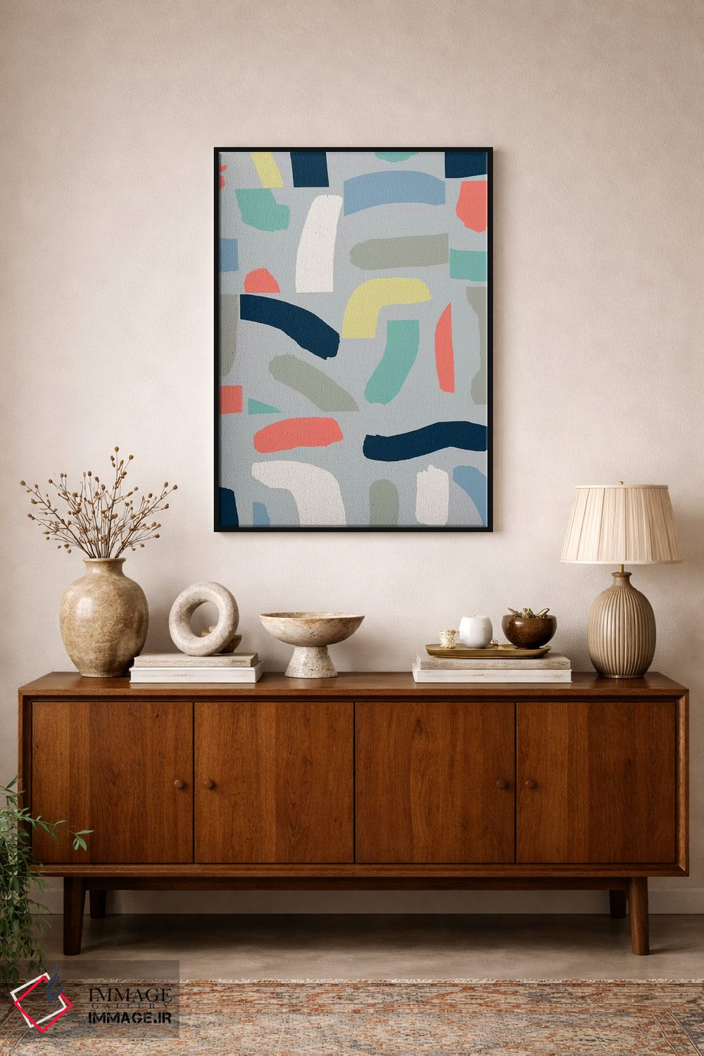 براساس پالت ترکیبی اثر، قاب تیک گرم (چوبی) پیشنهاد اول است و مشکی مات (فریم متوسط) مکمل. برای سفارشهای پروژهای با ابعاد و قابهای اختصاصی با ایماژ در تماس باشید.