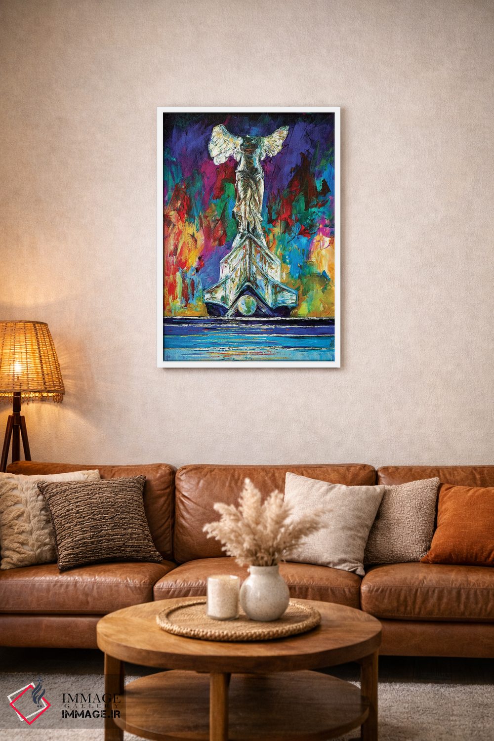 براساس پالت ترکیبی اثر، قاب تیک گرم (چوبی) پیشنهاد اول است و مشکی مات (فریم متوسط) مکمل. برای سفارشهای پروژهای با ابعاد و قابهای اختصاصی با ایماژ در تماس باشید.