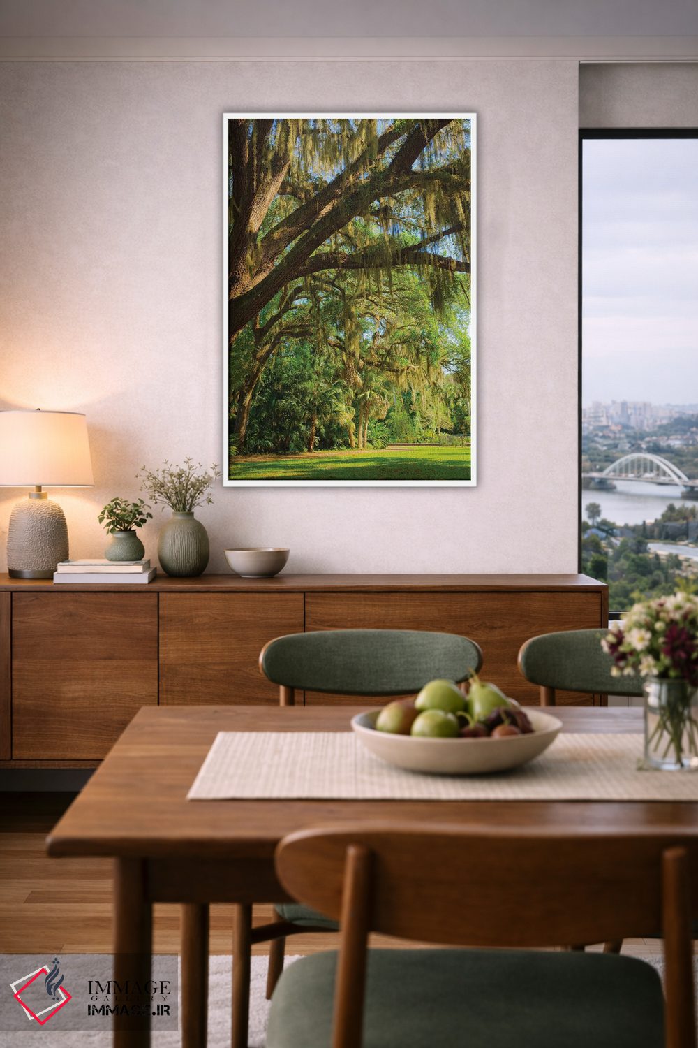 برای دیواری که میخواهید نرمتر دیده شود، «Florida. Tropical garden with palm trees and living oak covered in Spanish moss.، ایالات متحده، فلوریدا. باغ گرمسیری با نخل و بلوط زنده پوشیده از خزه اسپانیایی» اثرِ «آنا میلر» برای دیوارهای ساده، یک لطافتِ دقیق میسازد؛ برای کافهها و فضاهای آرام انتخابی خوشسلیقه است. حضورش آرام است، اما بیاثر نیست.