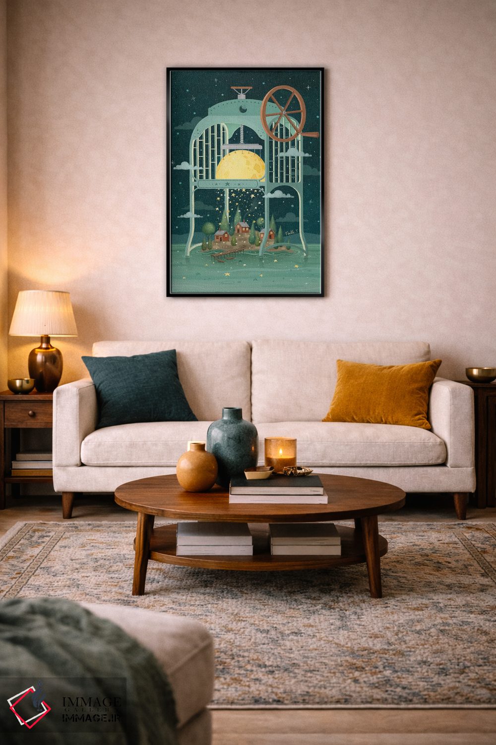 براساس پالت ترکیبی اثر، قاب تیک گرم (چوبی) پیشنهاد اول است و مشکی مات (فریم متوسط) مکمل. برای سفارشهای پروژهای با ابعاد و قابهای اختصاصی با ایماژ در تماس باشید.