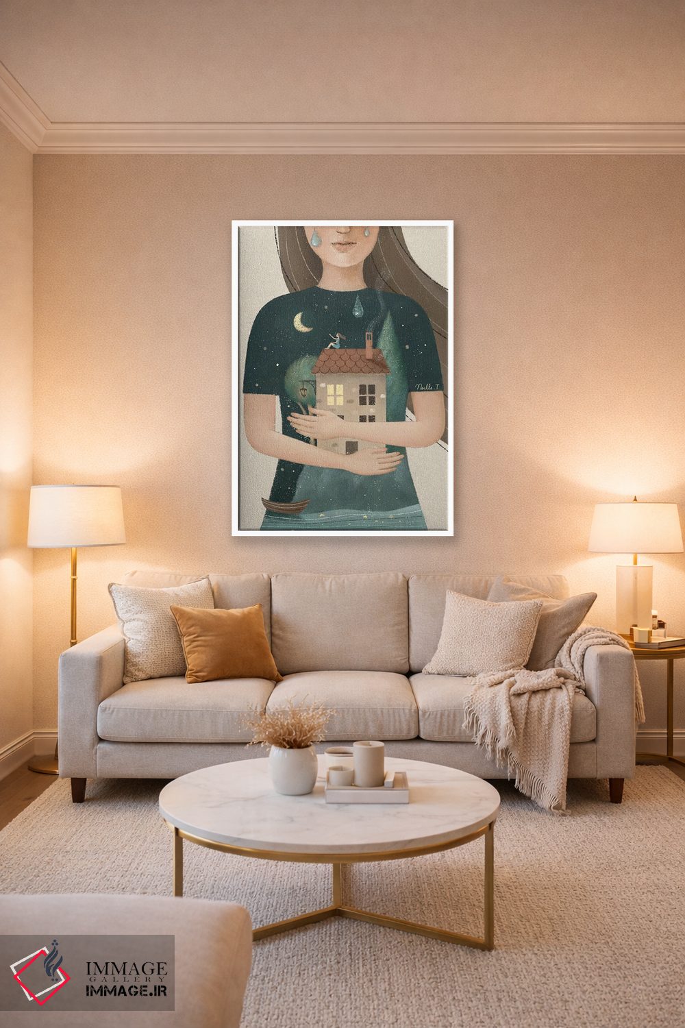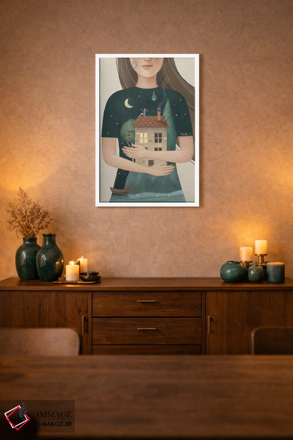 براساس پالت گرم اثر، قاب بلوط روشن (چوبی) پیشنهاد اول است و استخوانی ملایم مکمل. برای سفارشهای پروژهای با ابعاد و قابهای اختصاصی با ایماژ در تماس باشید.