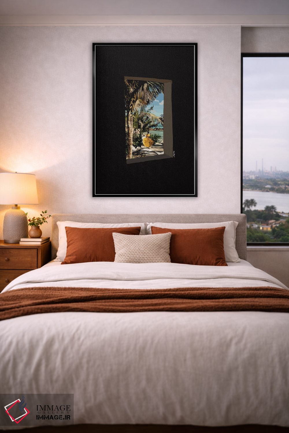 براساس پالت گرم اثر، قاب بلوط روشن (چوبی) پیشنهاد اول است و استخوانی ملایم مکمل. برای سفارشهای پروژهای با ابعاد و قابهای اختصاصی با ایماژ در تماس باشید.
