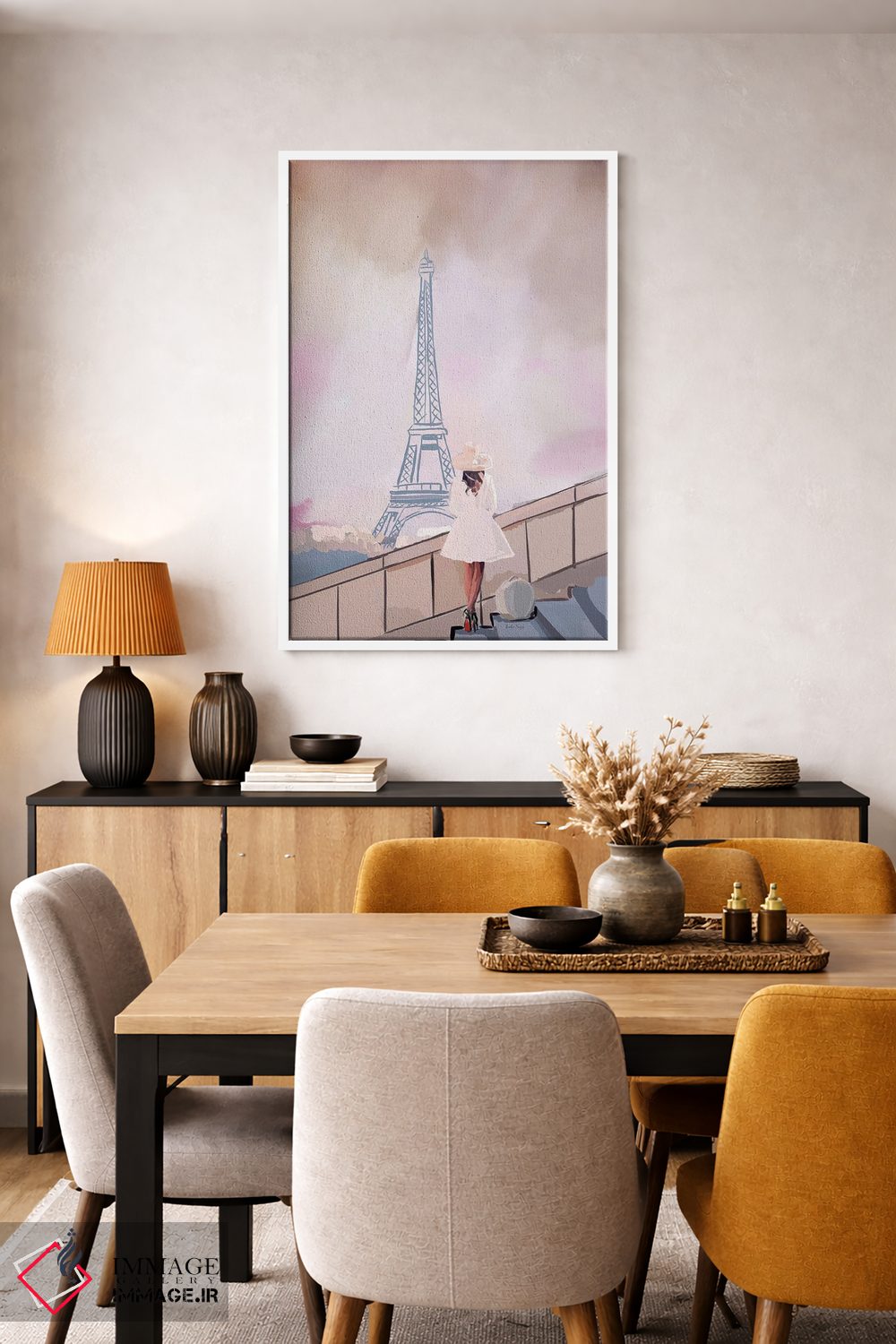 براساس پالت گرم اثر، قاب تیک گرم (چوبی) پیشنهاد اول است و مشکی مات (فریم متوسط) مکمل. برای سفارشهای پروژهای با ابعاد و قابهای اختصاصی با ایماژ در تماس باشید.