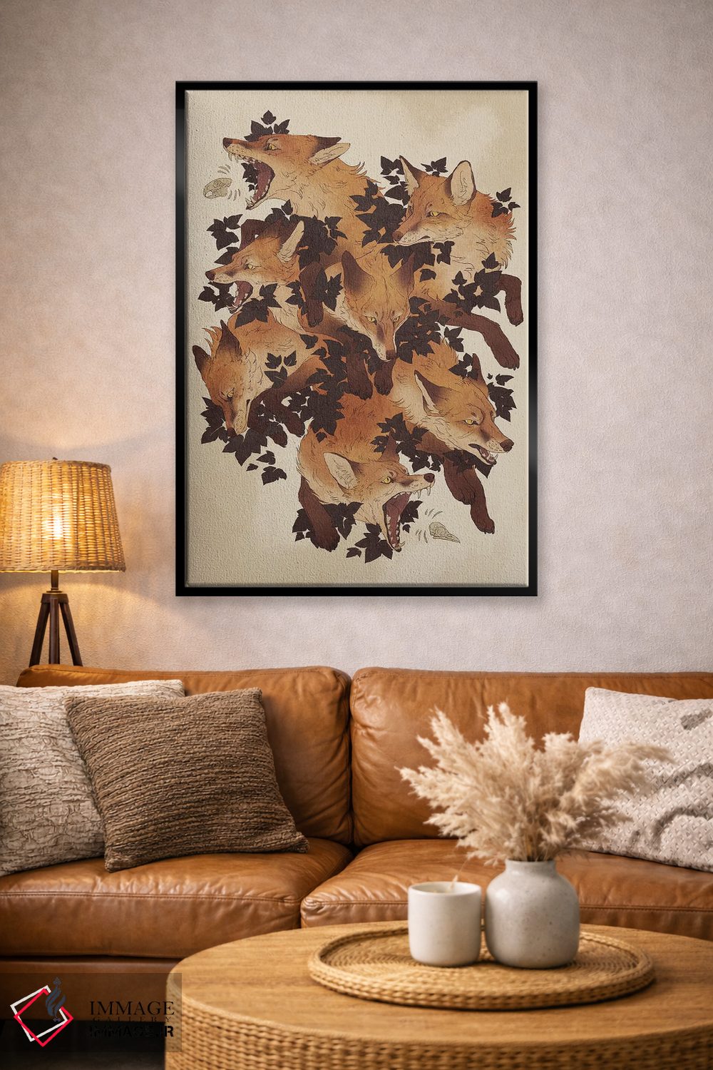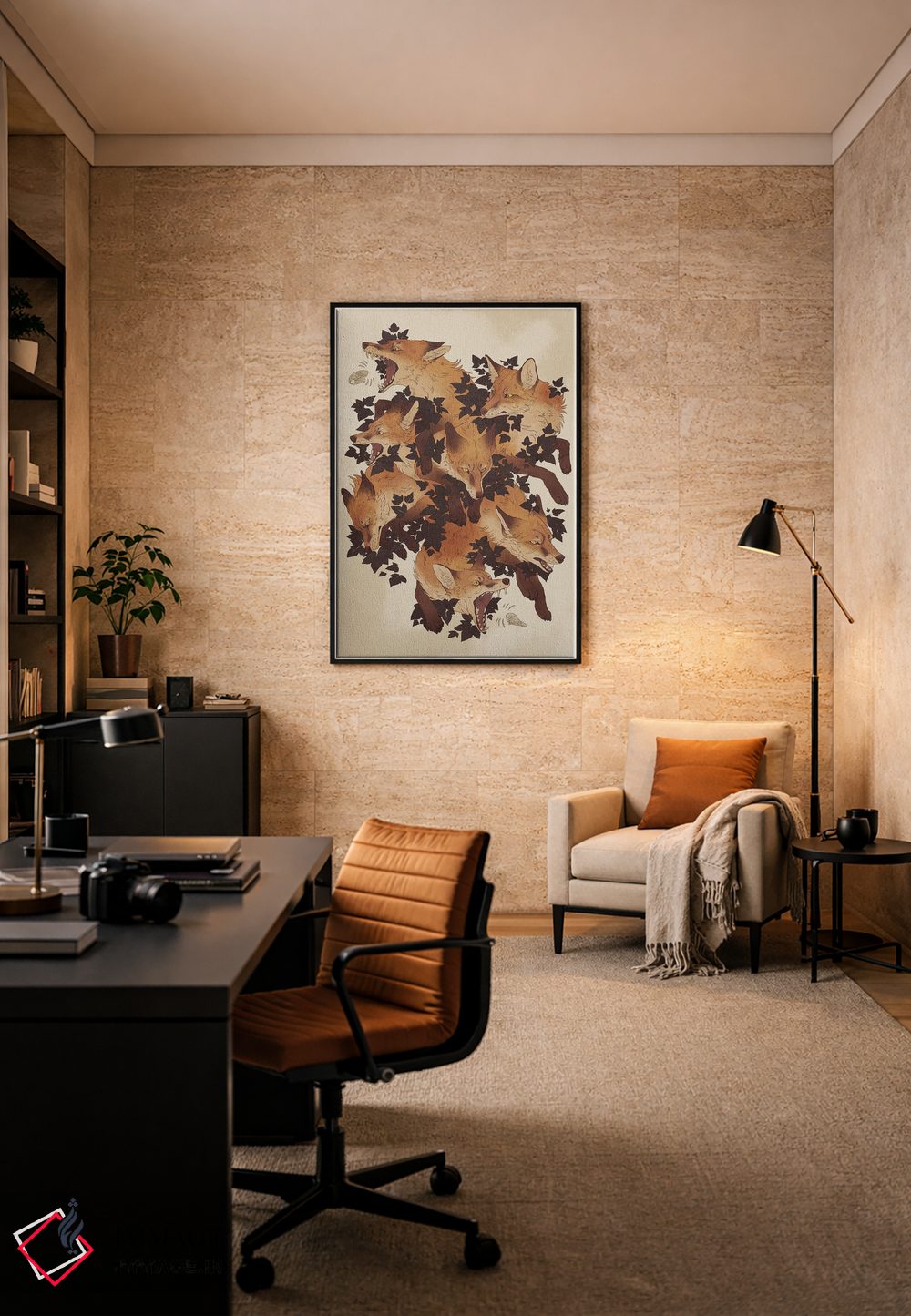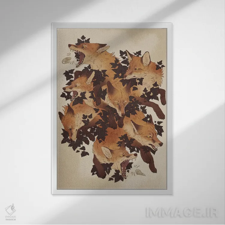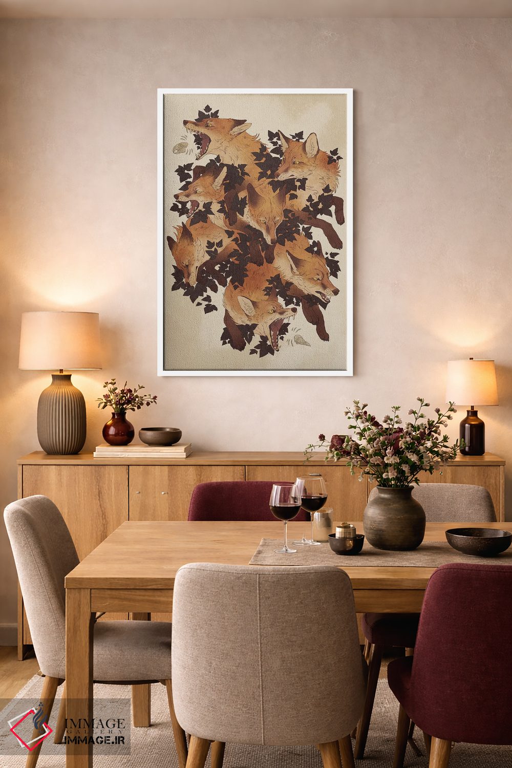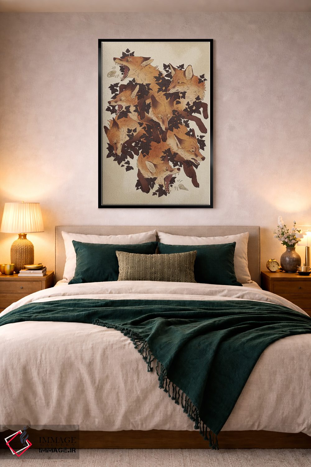 براساس پالت گرم اثر، قاب بلوط روشن (چوبی) پیشنهاد اول است و استخوانی ملایم مکمل. برای سفارشهای پروژهای با ابعاد و قابهای اختصاصی با ایماژ در تماس باشید.
