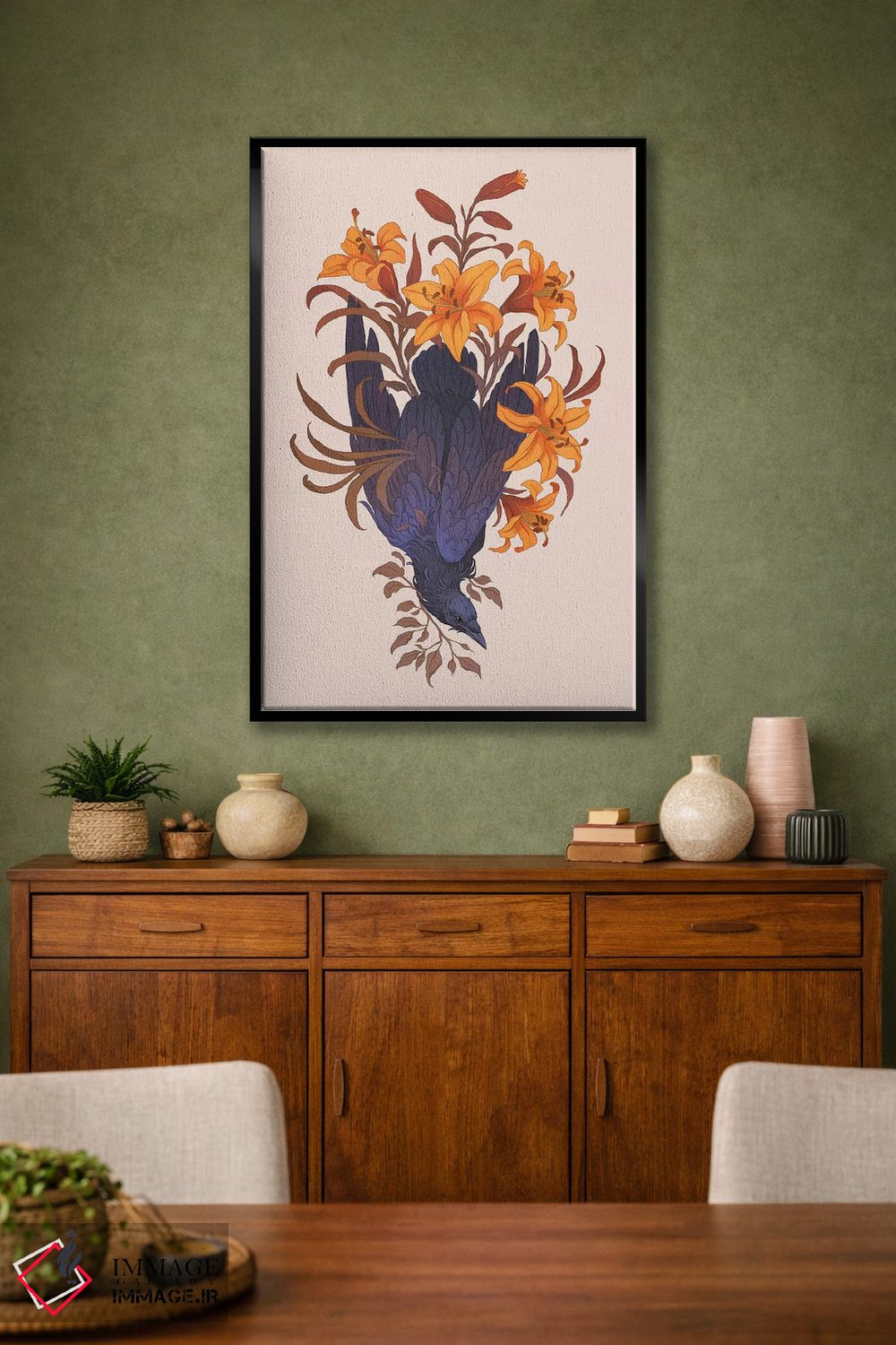 براساس پالت گرم اثر، قاب تیک گرم (چوبی) پیشنهاد اول است و مشکی مات (فریم متوسط) مکمل. برای سفارشهای پروژهای با ابعاد و قابهای اختصاصی با ایماژ در تماس باشید.