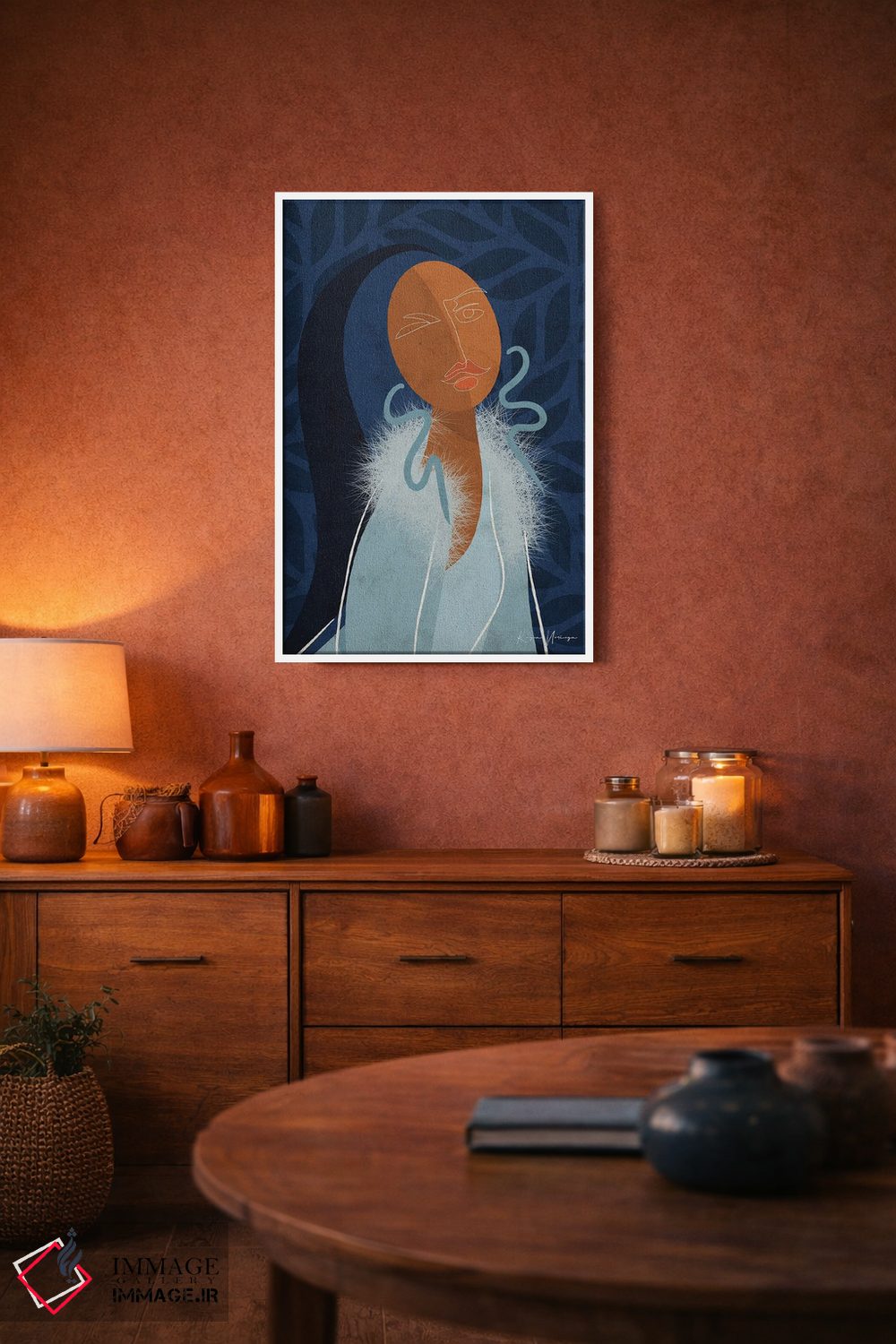 براساس پالت ترکیبی اثر، قاب تیک گرم (چوبی) پیشنهاد اول است و مشکی مات (فریم متوسط) مکمل. برای سفارشهای پروژهای با ابعاد و قابهای اختصاصی با ایماژ در تماس باشید.