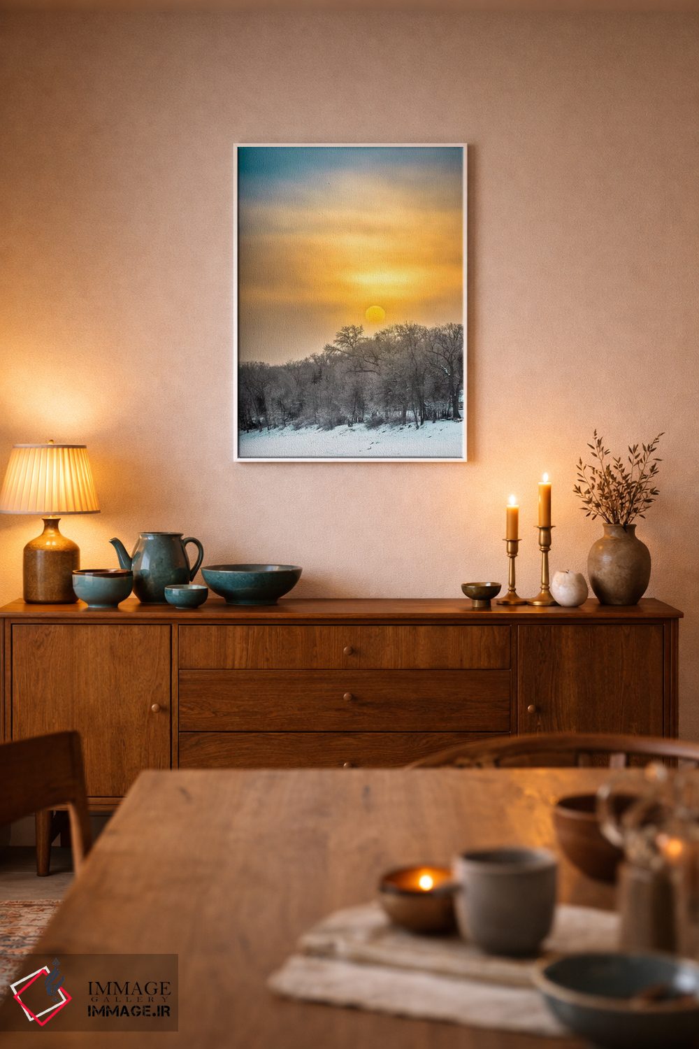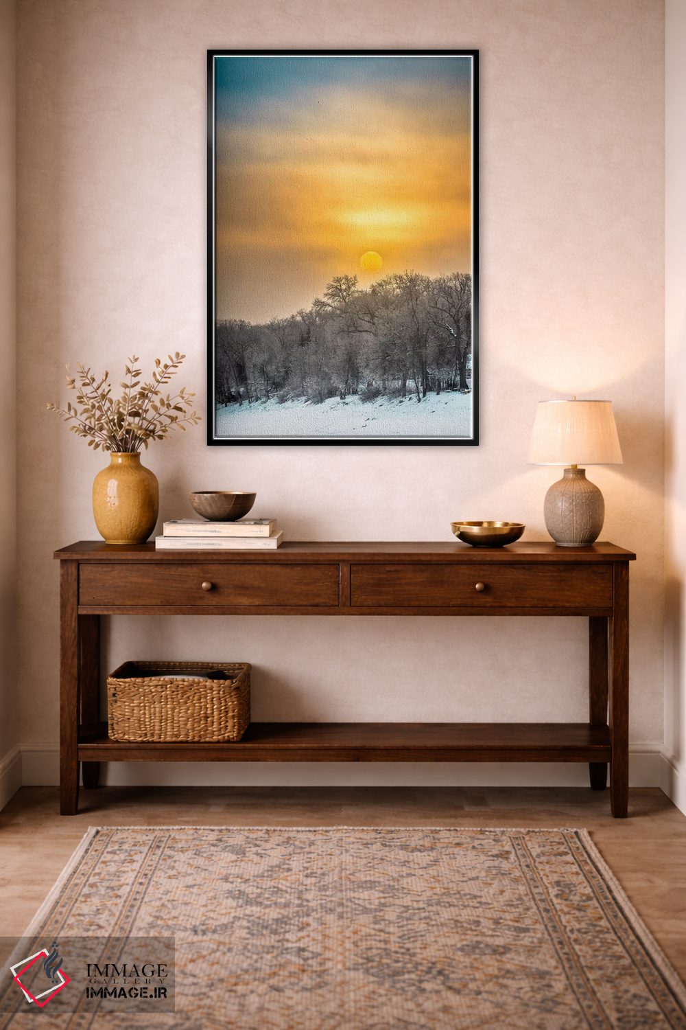 این تابلو با عنوان «طلوع بر رودخانه یخزده» اثرِ «نیک ریو» حس گالریوار را بیسروصدا وارد خانه میکند؛ برای دیوار بالای کنسول یا شومینه پیشنهاد میشود. حضورش روی دیوار «مرتب» است؛ نه پر سر و صدا، نه بیاثر.