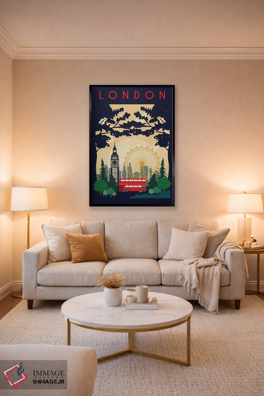 براساس پالت گرم اثر، قاب بلوط روشن (چوبی) پیشنهاد اول است و استخوانی ملایم مکمل. برای سفارشهای پروژهای با ابعاد و قابهای اختصاصی با ایماژ در تماس باشید.