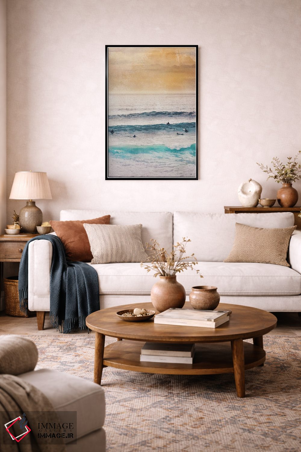 براساس پالت ترکیبی اثر، قاب بلوط روشن (چوبی) پیشنهاد اول است و استخوانی ملایم مکمل. برای سفارشهای پروژهای با ابعاد و قابهای اختصاصی با ایماژ در تماس باشید.