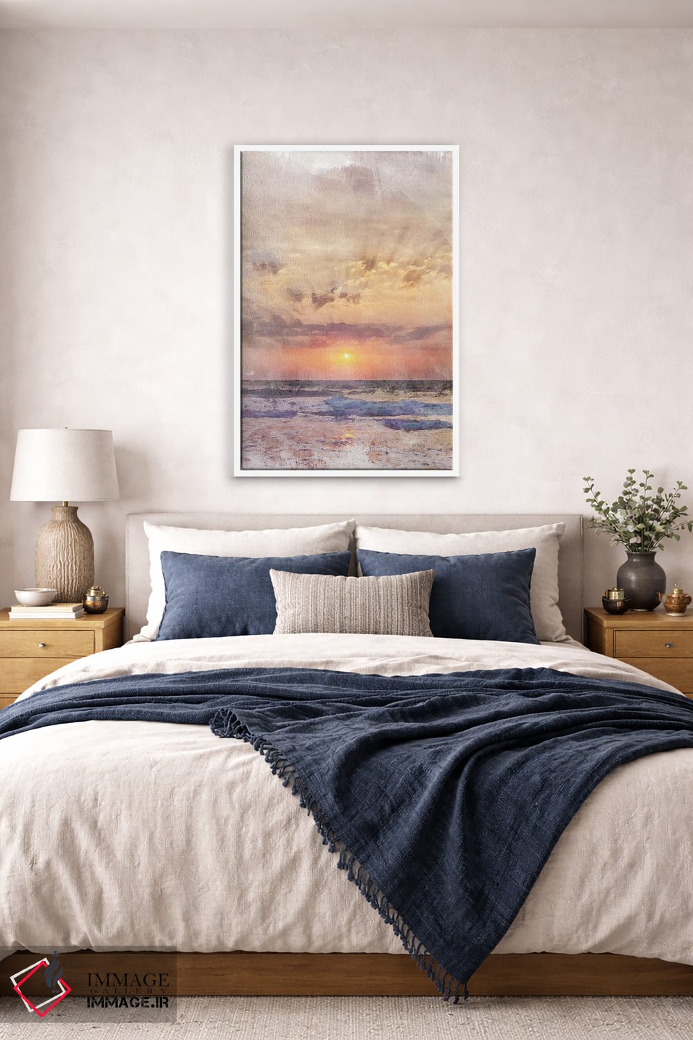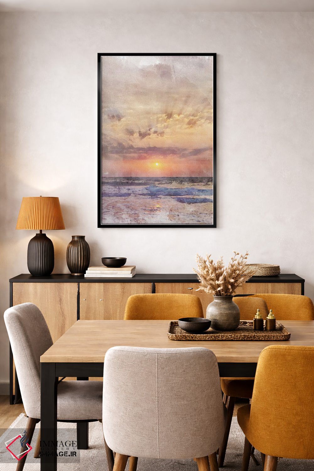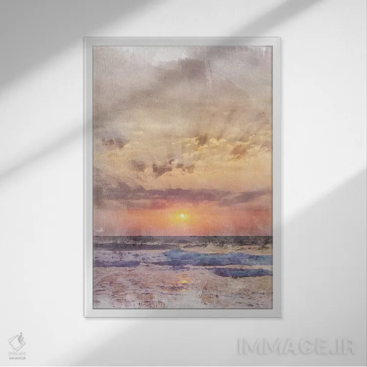 براساس پالت گرم اثر، قاب بلوط روشن (چوبی) پیشنهاد اول است و استخوانی ملایم مکمل. برای سفارشهای پروژهای با ابعاد و قابهای اختصاصی با ایماژ در تماس باشید.