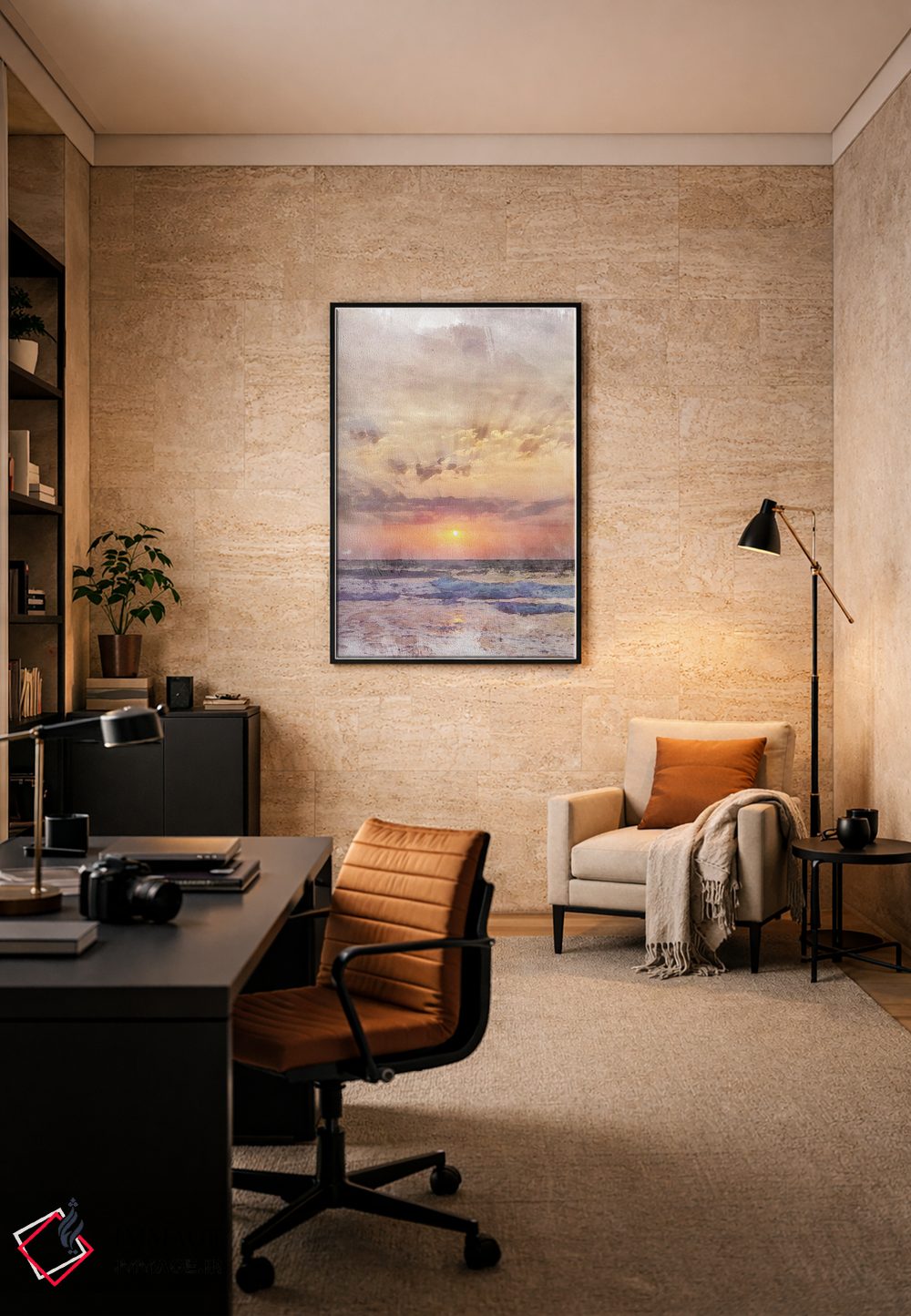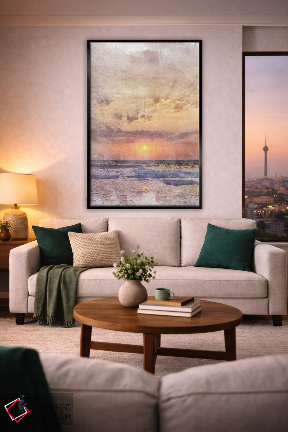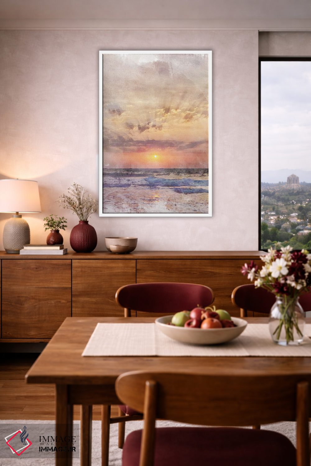 براساس پالت گرم اثر، قاب بلوط روشن (چوبی) پیشنهاد اول است و استخوانی ملایم مکمل. برای سفارشهای پروژهای با ابعاد و قابهای اختصاصی با ایماژ در تماس باشید.