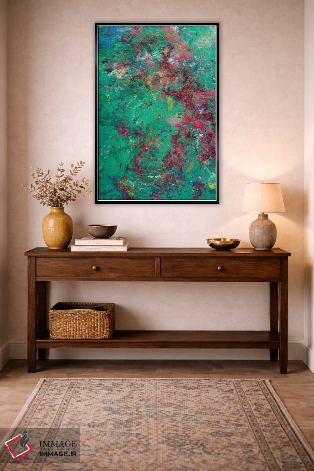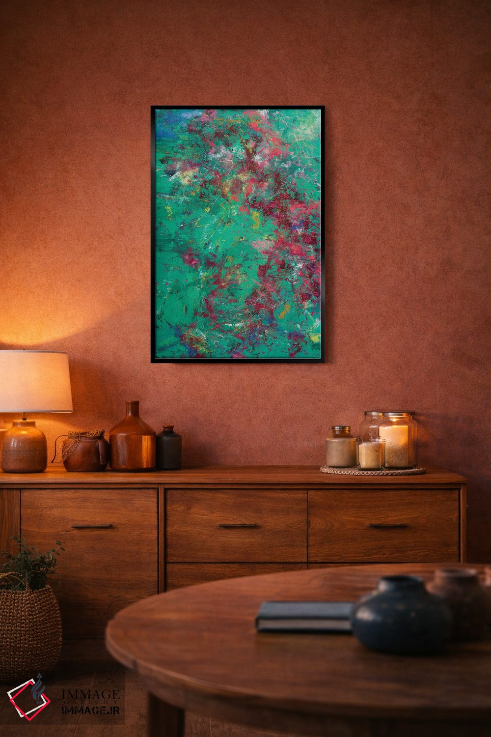 براساس پالت ترکیبی اثر، قاب تیک گرم (چوبی) پیشنهاد اول است و مشکی مات (فریم متوسط) مکمل. برای سفارشهای پروژهای با ابعاد و قابهای اختصاصی با ایماژ در تماس باشید.