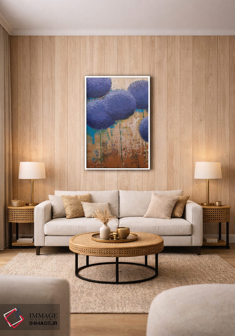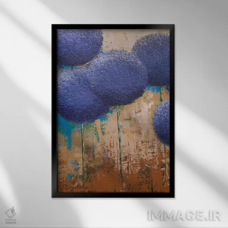 براساس پالت ترکیبی اثر، قاب تیک گرم (چوبی) پیشنهاد اول است و مشکی مات (فریم متوسط) مکمل. برای سفارشهای پروژهای با ابعاد و قابهای اختصاصی با ایماژ در تماس باشید.