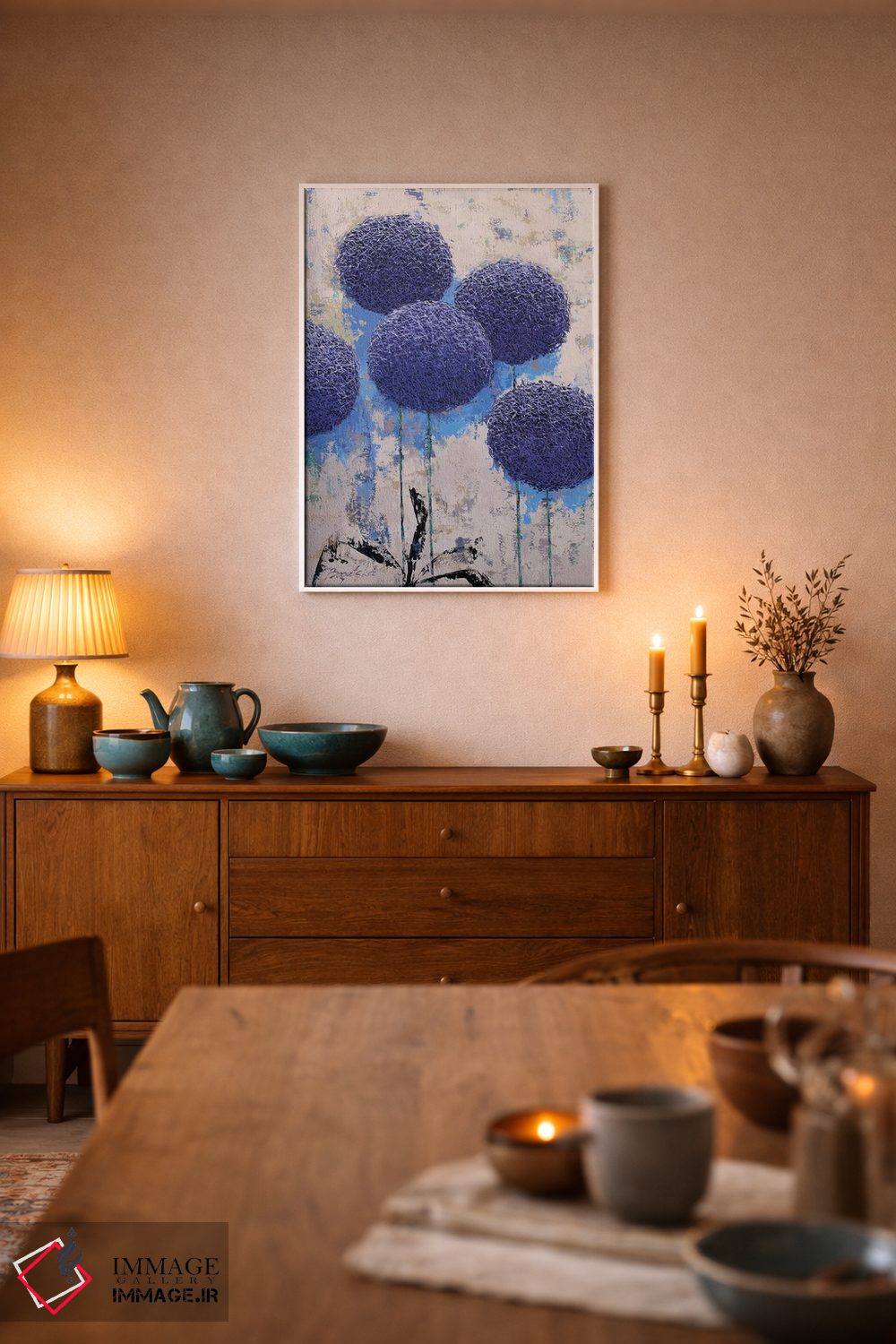 «هندسه باغ II» اثرِ «اولنا بوگاتسکا» مثل یک نفس تازه است؛ به دیوار، روشناییِ ملایم و دلنشین میدهد؛ برای راهروهای مینیمال انتخابی خوشسلیقه است. با قاب روشن یا چوبی، حس طبیعیتری پیدا میکند.