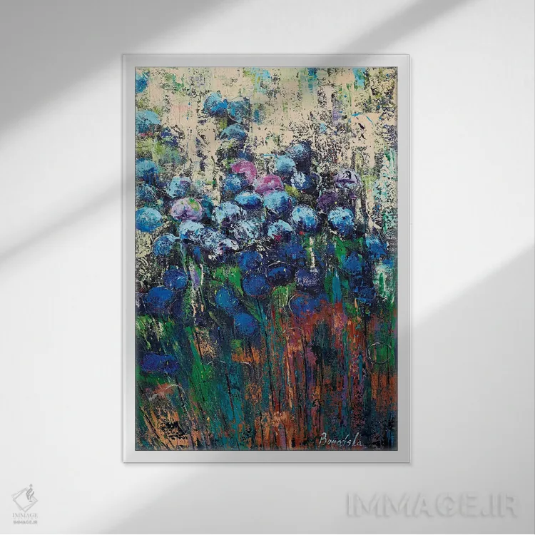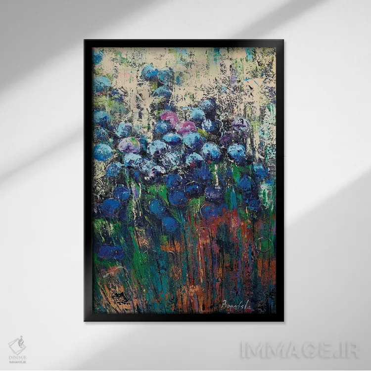 براساس پالت ترکیبی اثر، قاب تیک گرم (چوبی) پیشنهاد اول است و مشکی مات (فریم متوسط) مکمل. برای سفارشهای پروژهای با ابعاد و قابهای اختصاصی با ایماژ در تماس باشید.