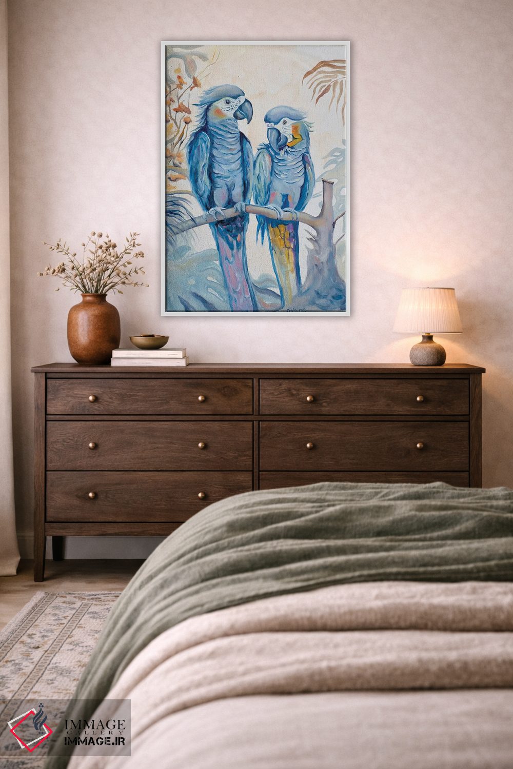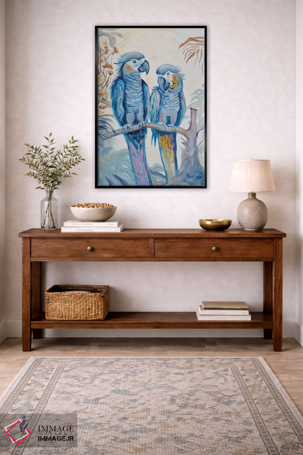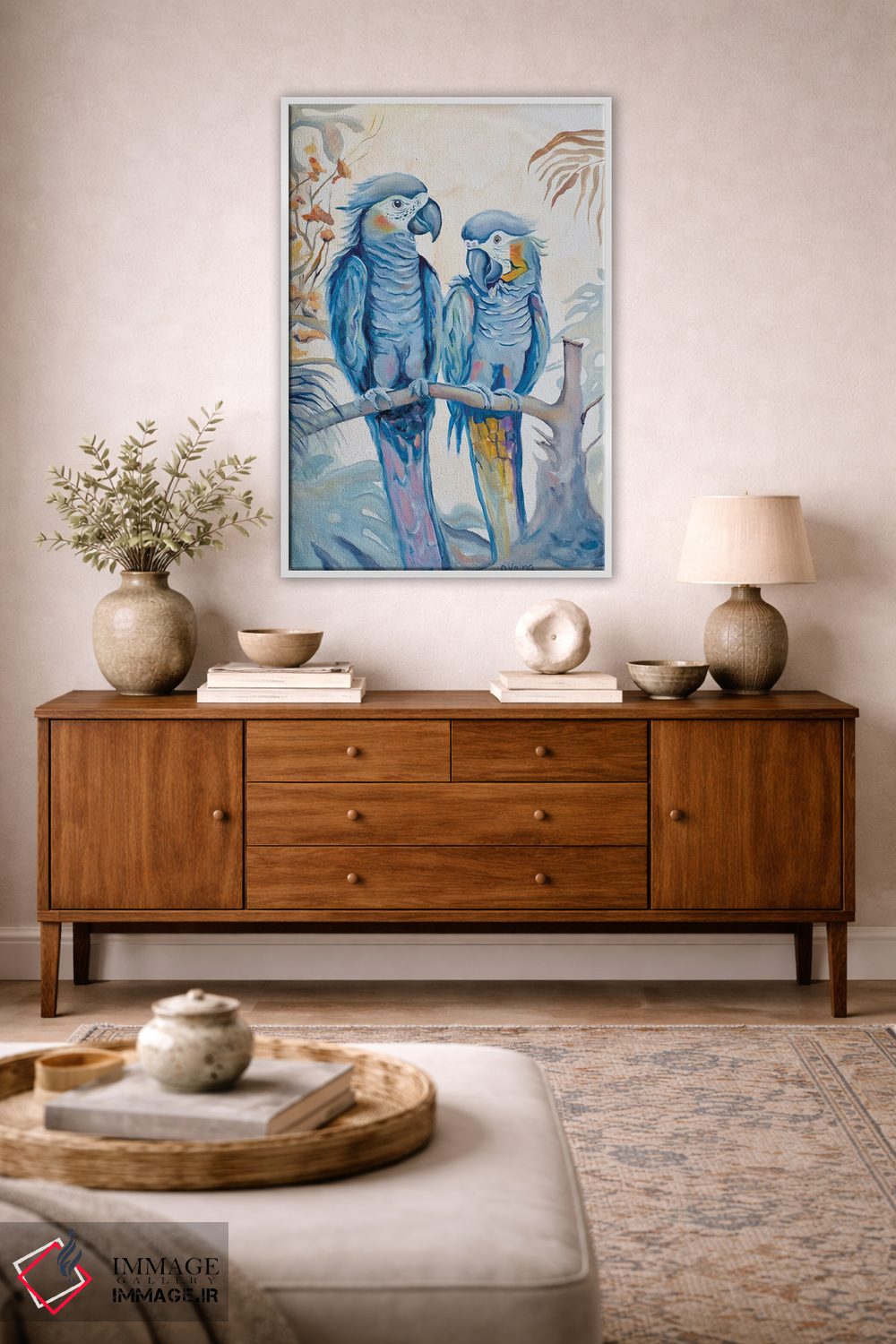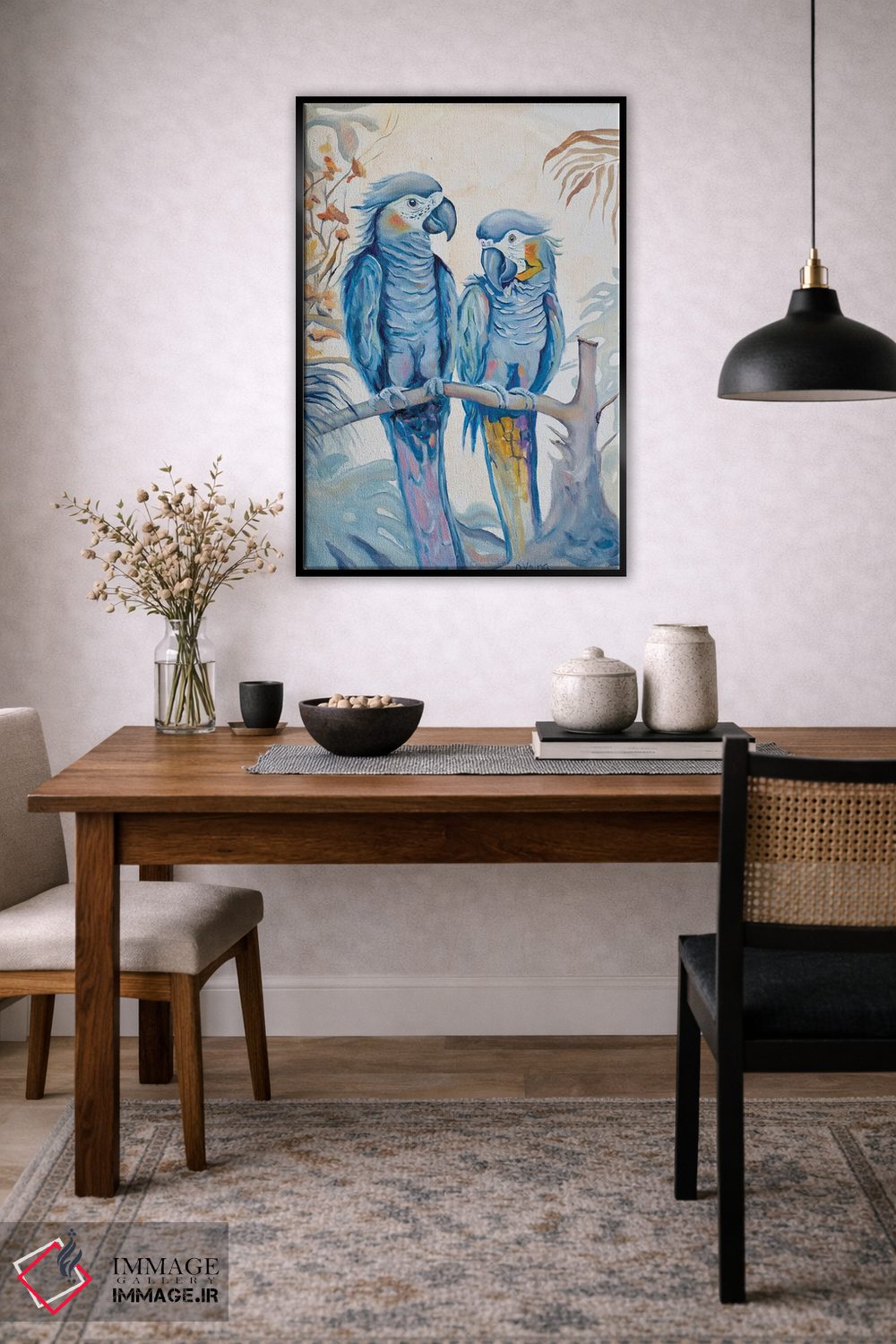 برای دیوارهای ساده، «طوطیهای عاشق» اثرِ «الگا وُلنا» برای دکورهای مینیمال، یک نقطهٔ توجه میسازد؛ برای نشیمنهای خانوادگی انتخابی خوشسلیقه است. به دیوار، قصه میدهد—اما قصهای آرام و شیک.