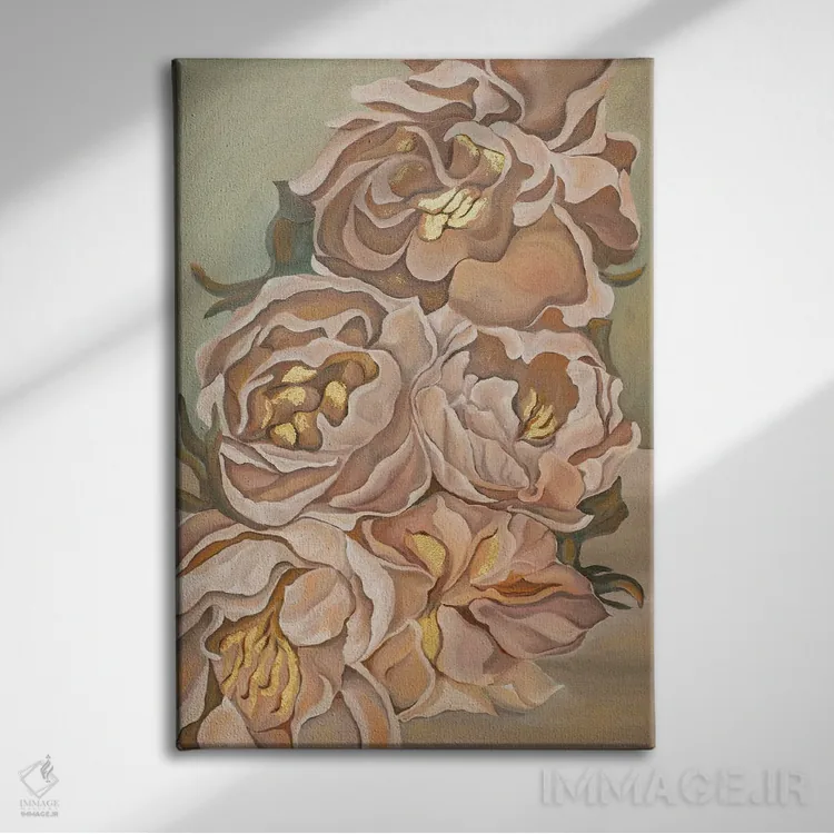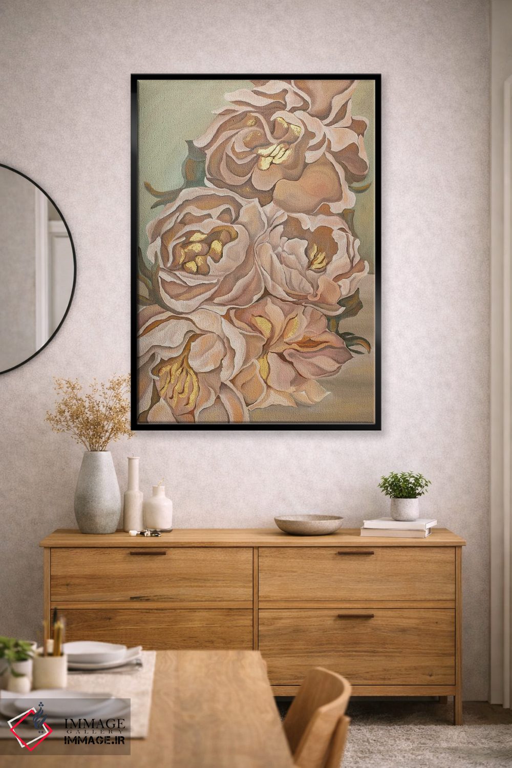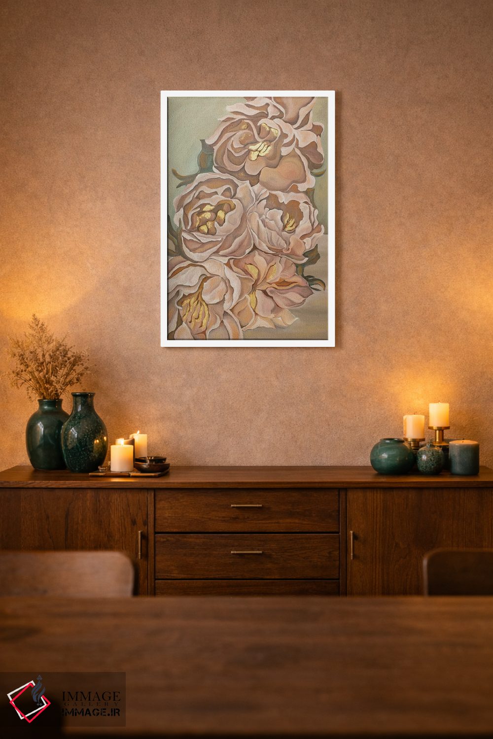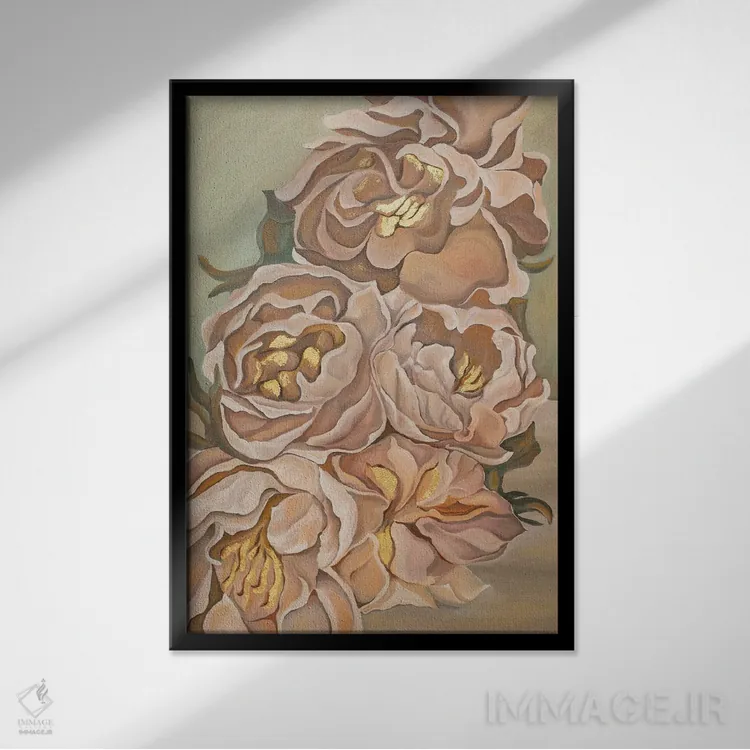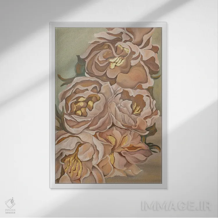 براساس پالت گرم اثر، قاب بلوط روشن (چوبی) پیشنهاد اول است و استخوانی ملایم مکمل. برای سفارشهای پروژهای با ابعاد و قابهای اختصاصی با ایماژ در تماس باشید.