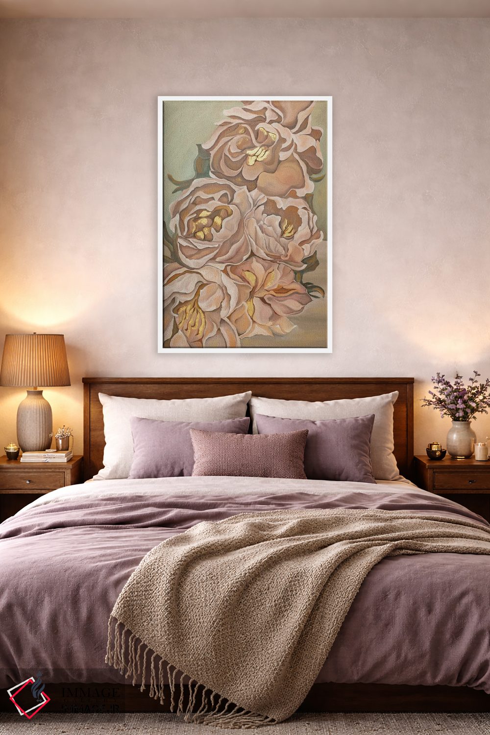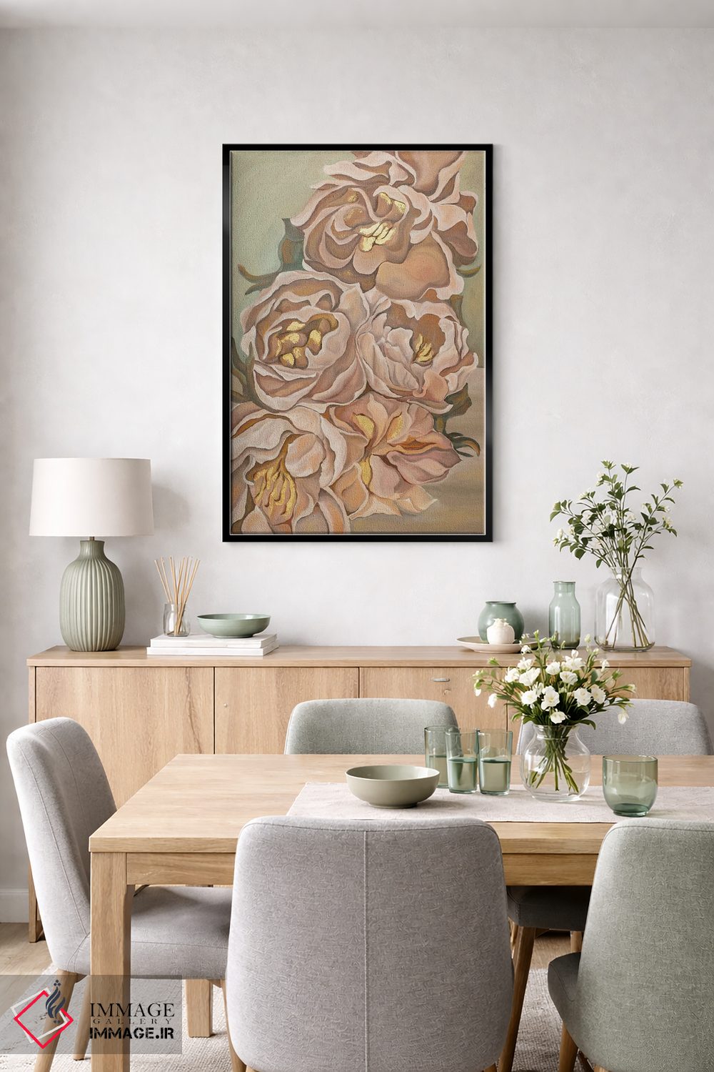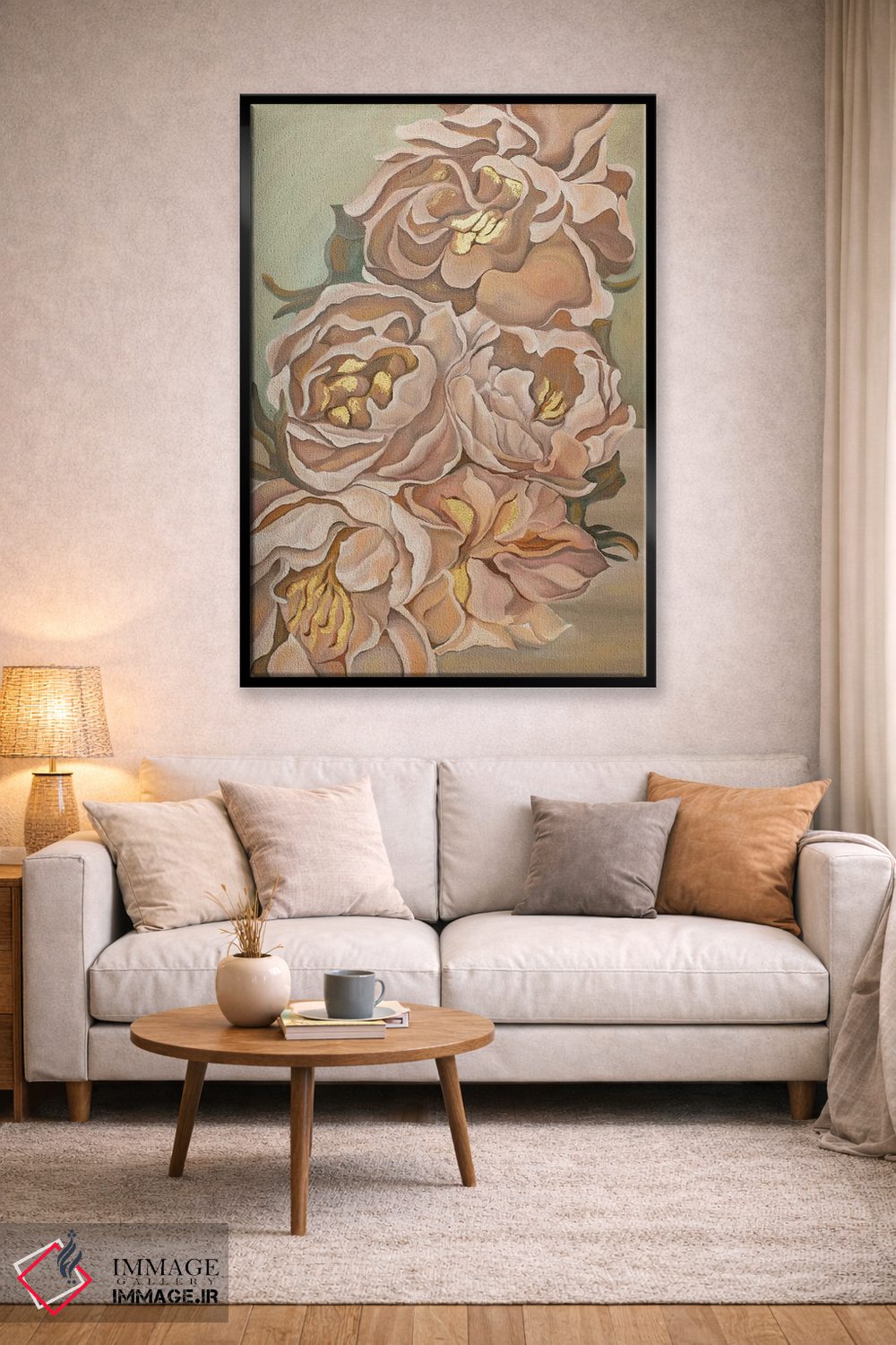 براساس پالت گرم اثر، قاب بلوط روشن (چوبی) پیشنهاد اول است و استخوانی ملایم مکمل. برای سفارشهای پروژهای با ابعاد و قابهای اختصاصی با ایماژ در تماس باشید.