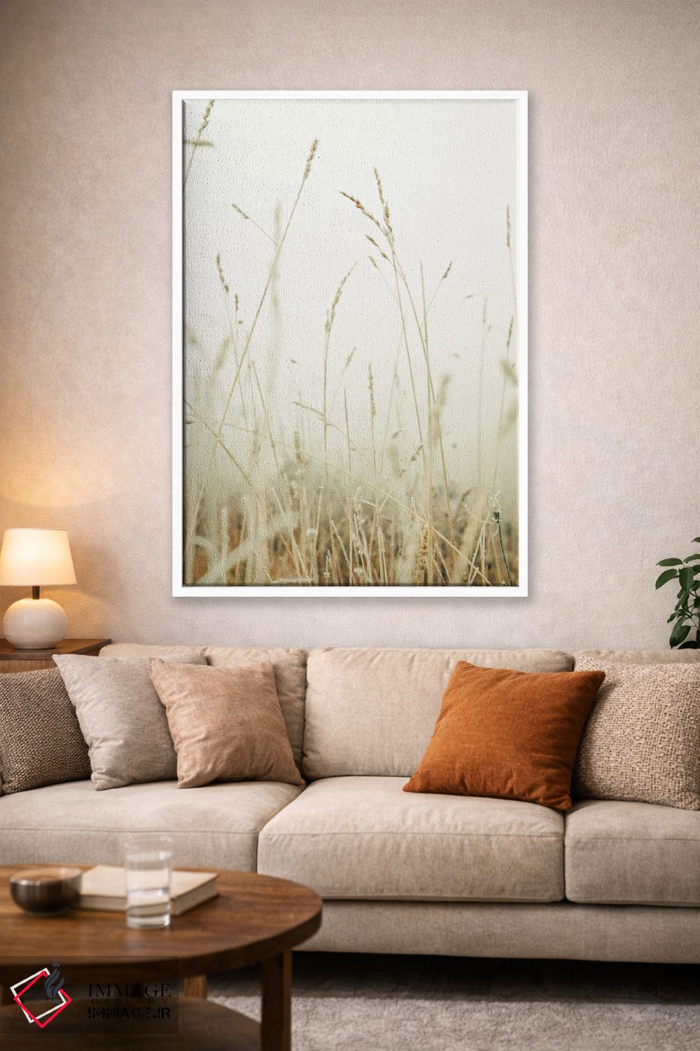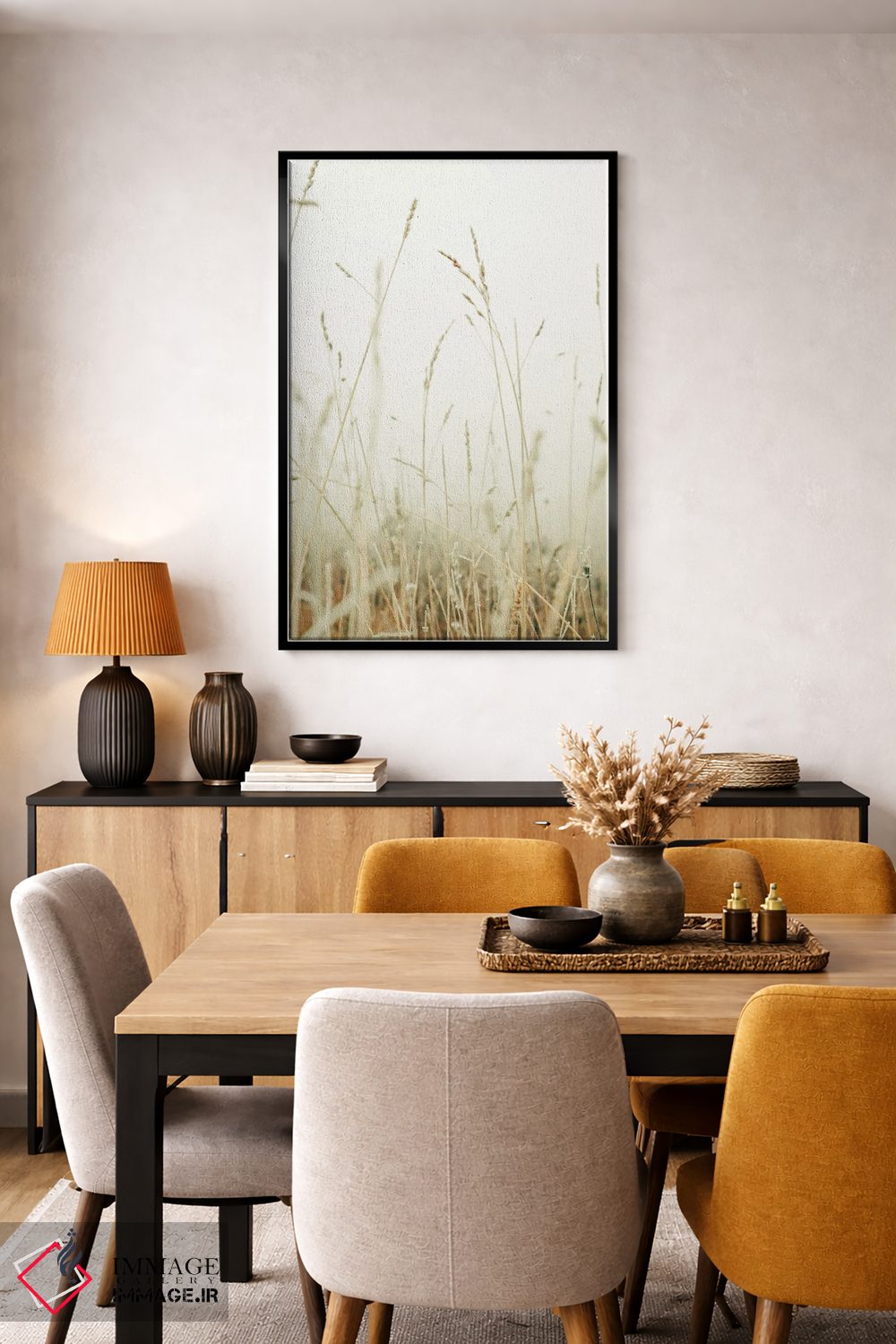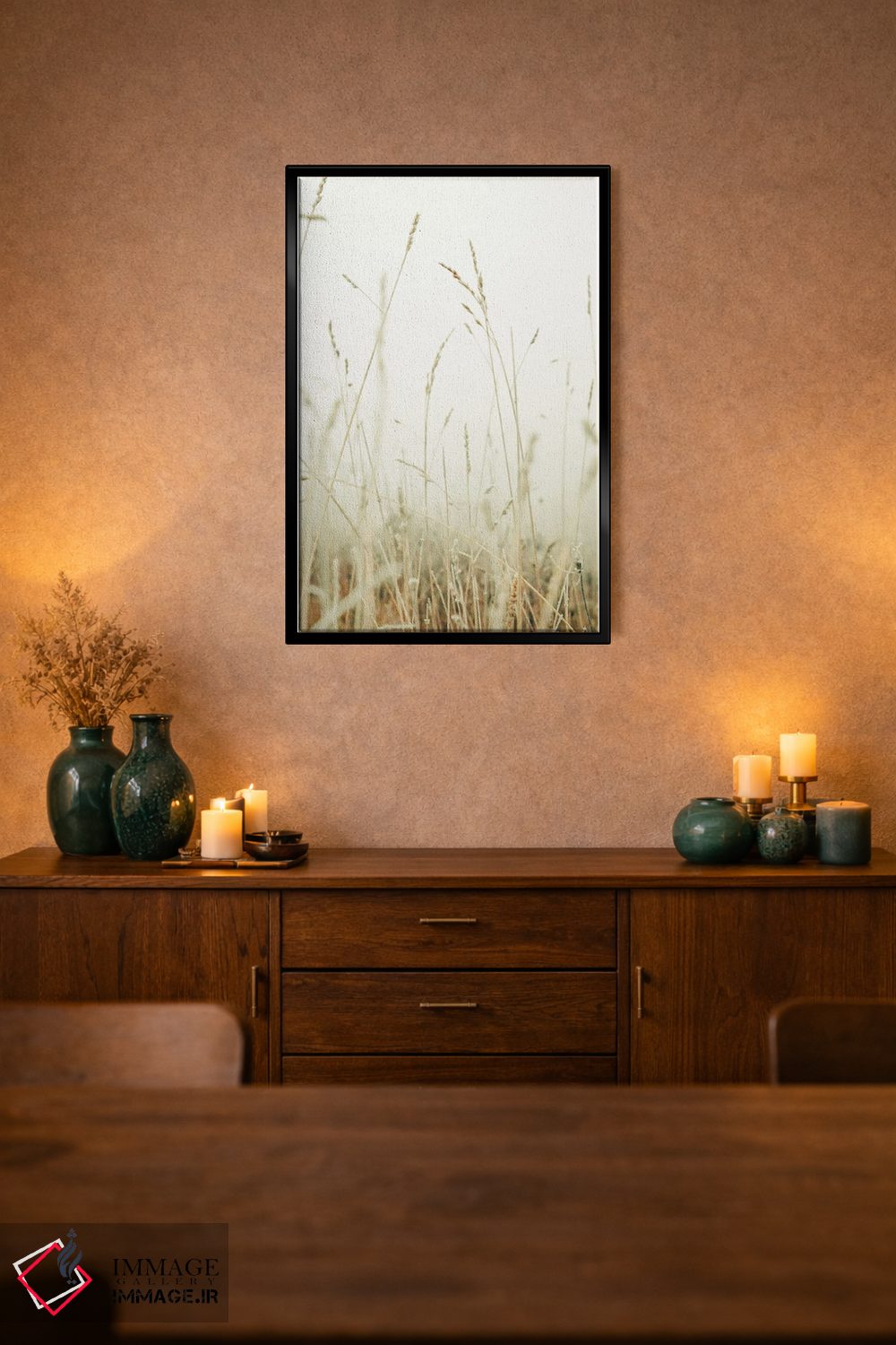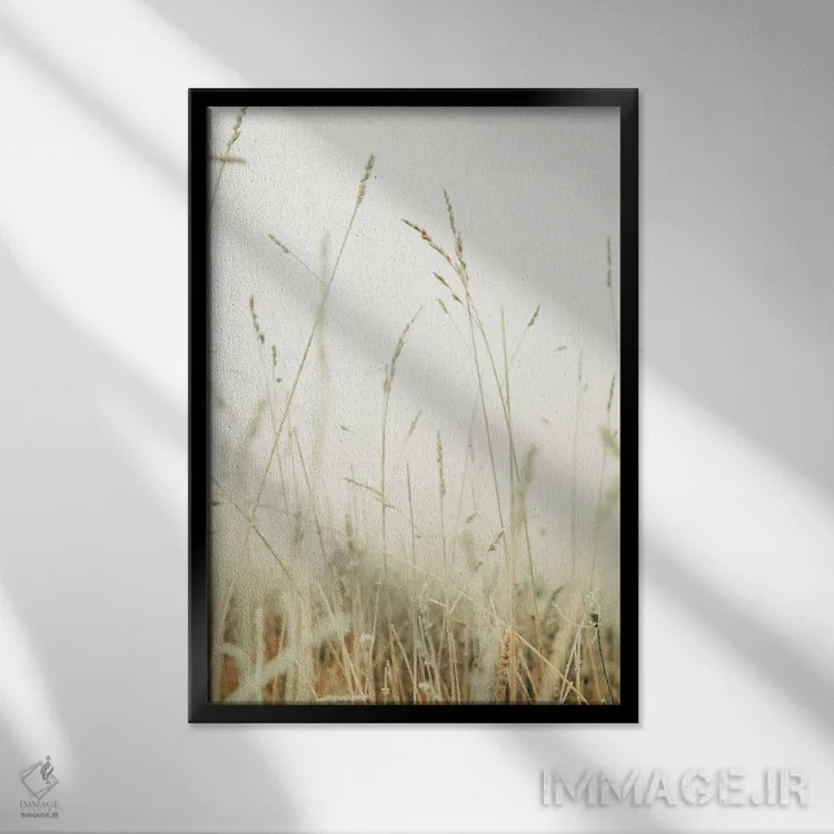 براساس پالت گرم اثر، قاب بلوط روشن (چوبی) پیشنهاد اول است و استخوانی ملایم مکمل. برای سفارشهای پروژهای با ابعاد و قابهای اختصاصی با ایماژ در تماس باشید.