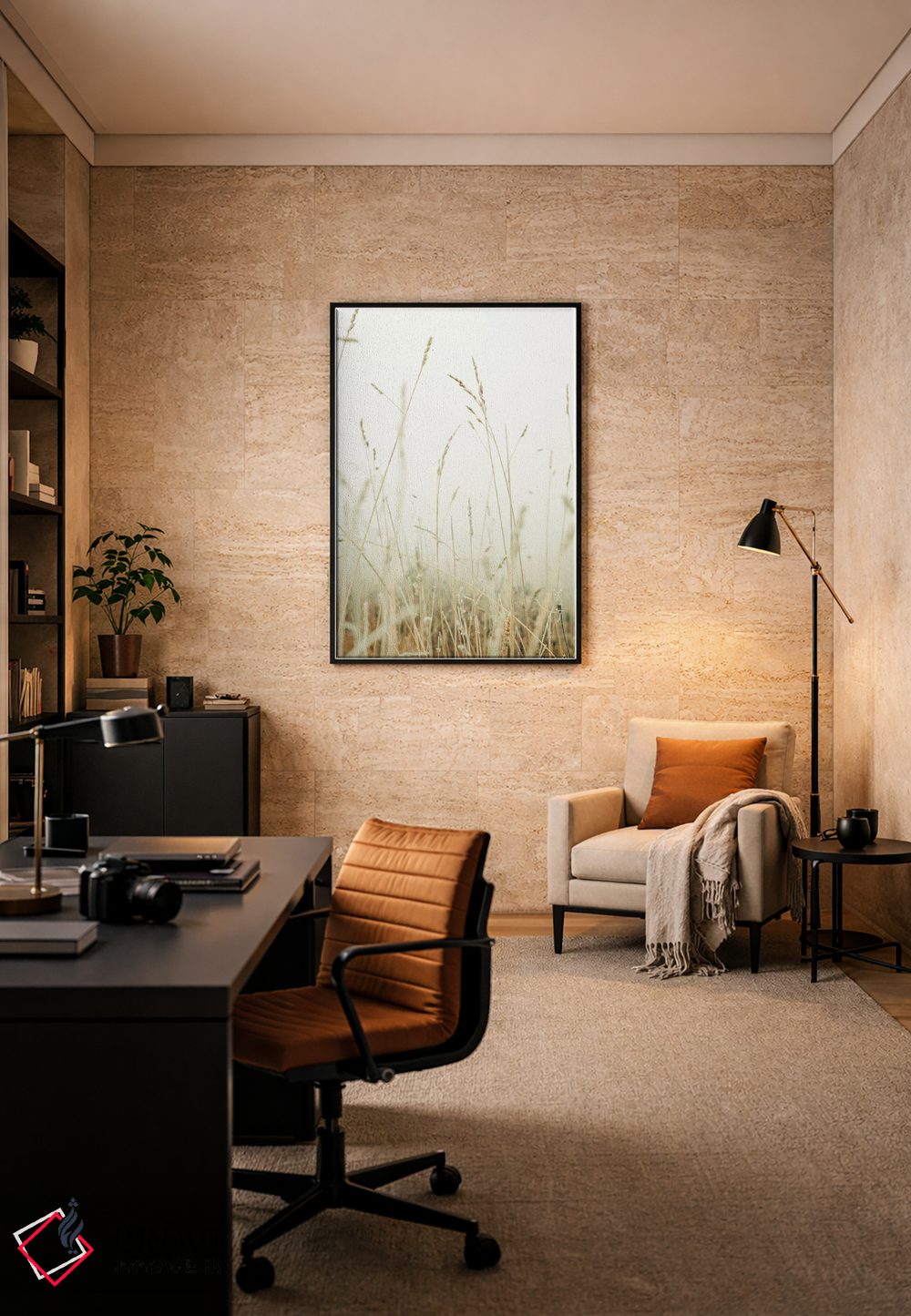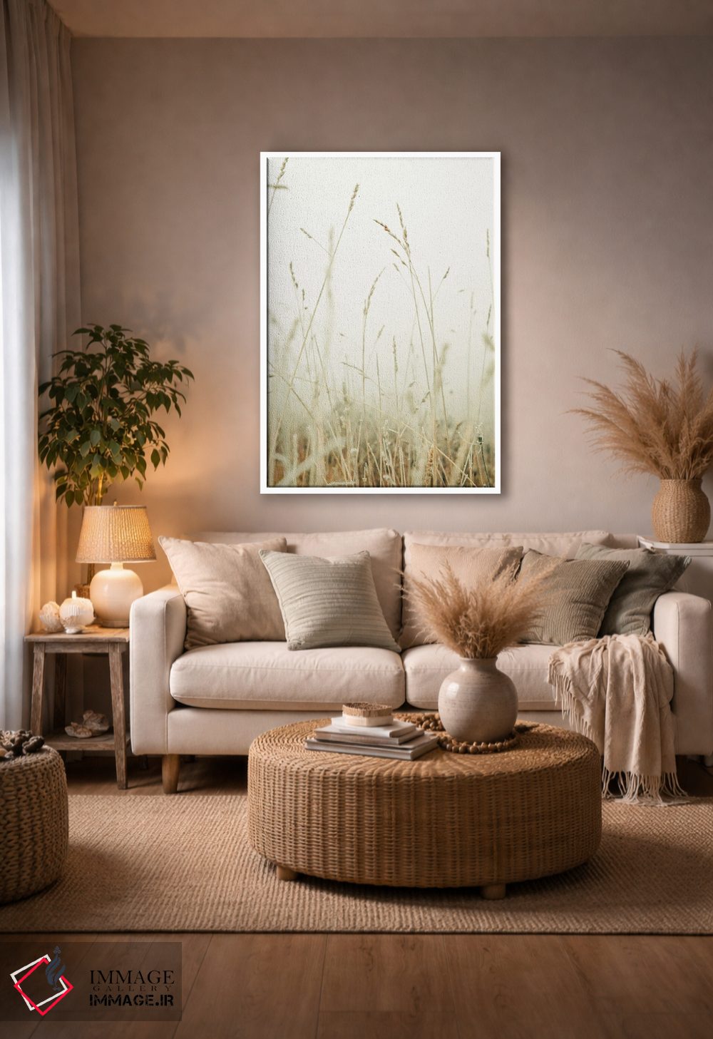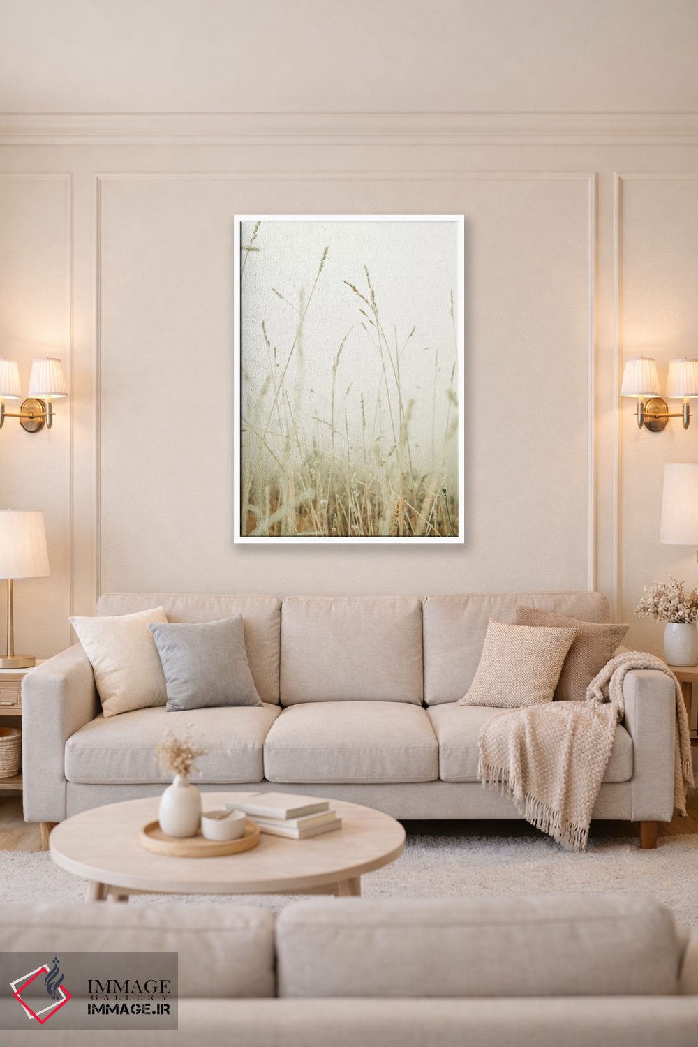 براساس پالت گرم اثر، قاب بلوط روشن (چوبی) پیشنهاد اول است و استخوانی ملایم مکمل. برای سفارشهای پروژهای با ابعاد و قابهای اختصاصی با ایماژ در تماس باشید.