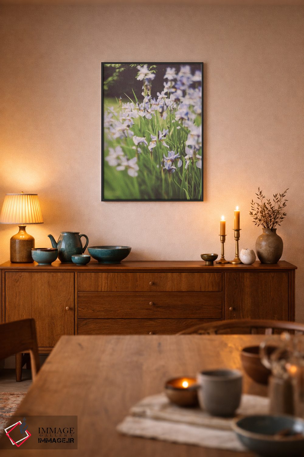 براساس پالت ترکیبی اثر، قاب تیک گرم (چوبی) پیشنهاد اول است و مشکی مات (فریم متوسط) مکمل. برای سفارشهای پروژهای با ابعاد و قابهای اختصاصی با ایماژ در تماس باشید.