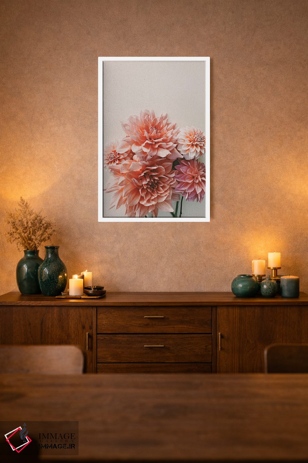 براساس پالت گرم اثر، قاب تیک گرم (چوبی) پیشنهاد اول است و مشکی مات (فریم متوسط) مکمل. برای سفارشهای پروژهای با ابعاد و قابهای اختصاصی با ایماژ در تماس باشید.