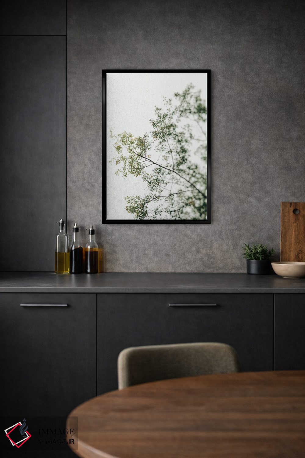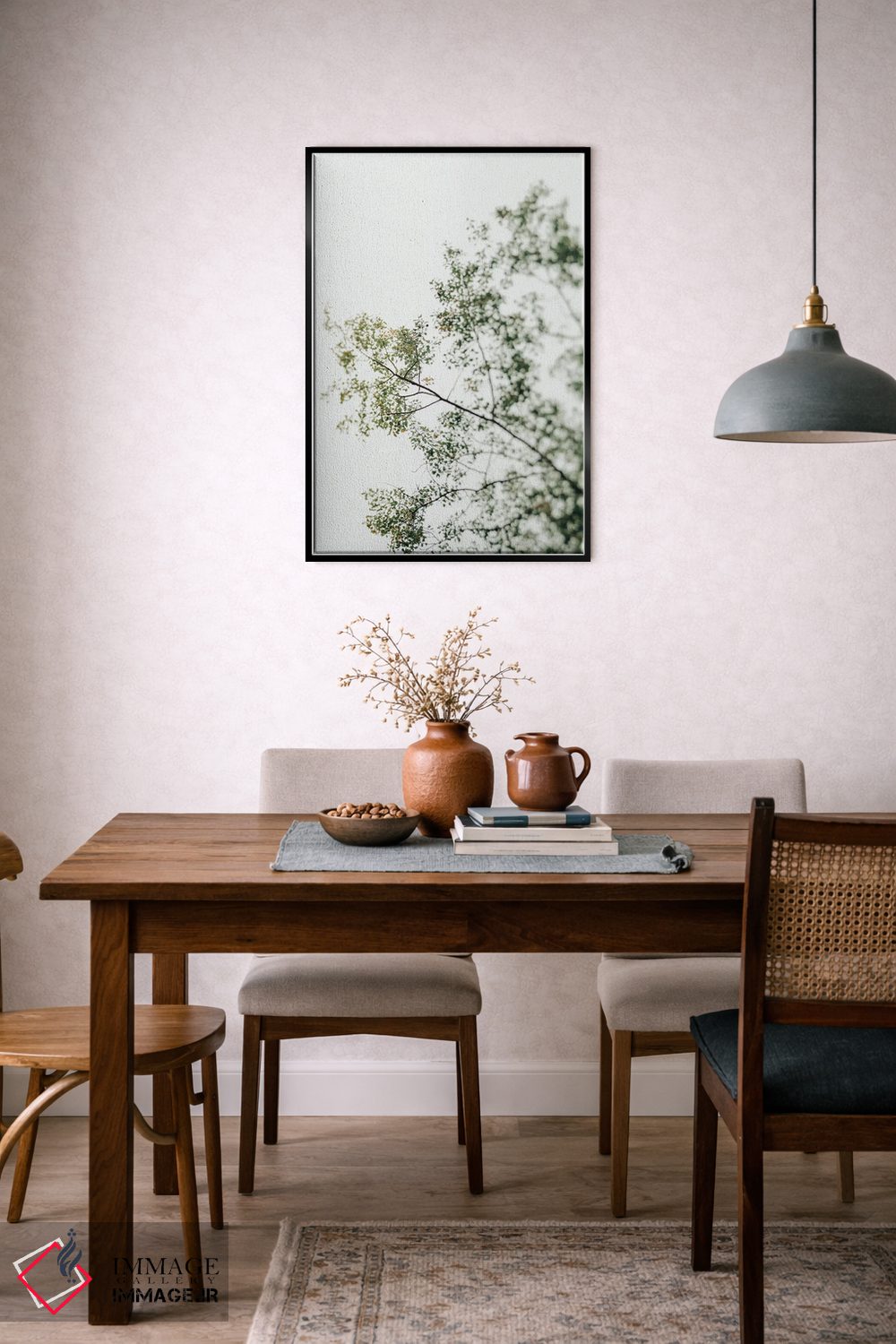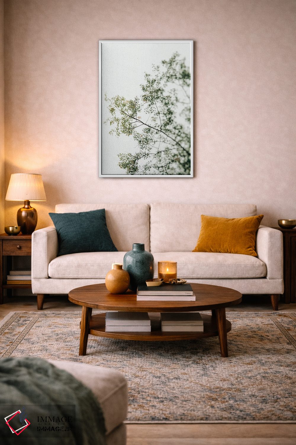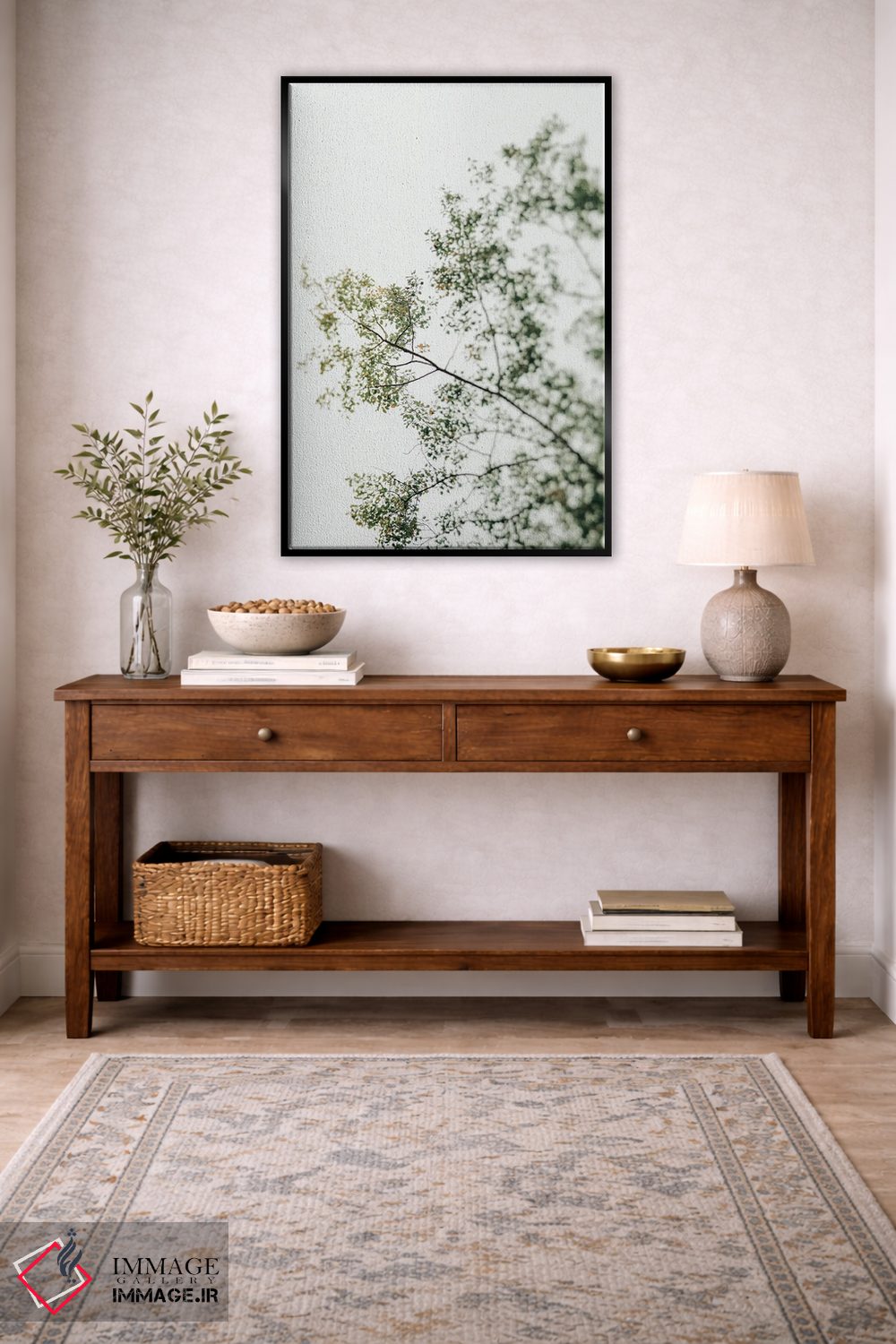 براساس پالت سرد اثر، قاب بلوط روشن (چوبی) پیشنهاد اول است و استخوانی ملایم مکمل. برای سفارشهای پروژهای با ابعاد و قابهای اختصاصی با ایماژ در تماس باشید.