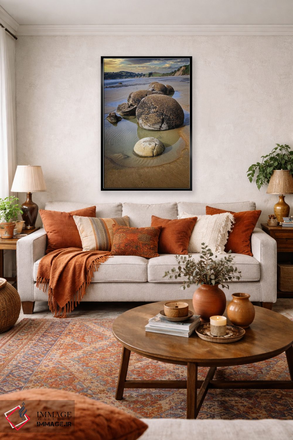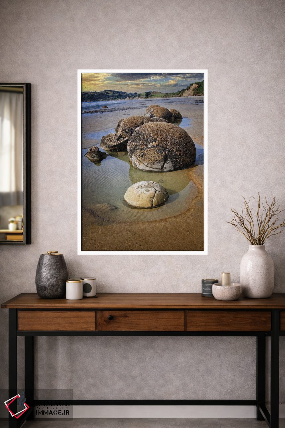 در این اثر، «صخرههای موئراکی، سواحل شرقی نیوزیلند» اثرِ «اولنا آرت (استودیو هنری)» یک حس «تمامشده و پرداختشده» ایجاد میکند؛ برای دکورهایی که بافت و جزئیات در آن مهم است پیشنهاد میشود. اگر میخواهید مهمانها مکث کنند، این اثر دلیل خوبیست.